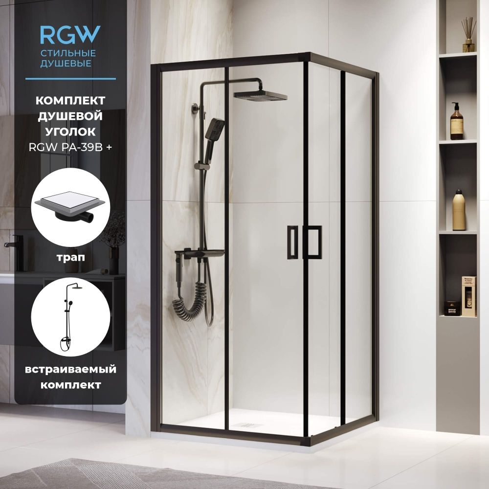Комплект квадрат: Душевой уголок RGW PA-39B 900x900 + Душевой трап RGW SDR-10 квадратный, черный, металлическая крышка, горизонтальный слив + Душевая стойка черная со смесителем из стали RGW SP-24B