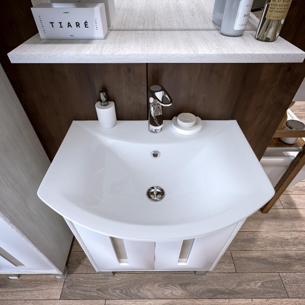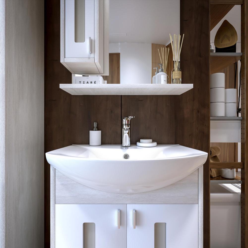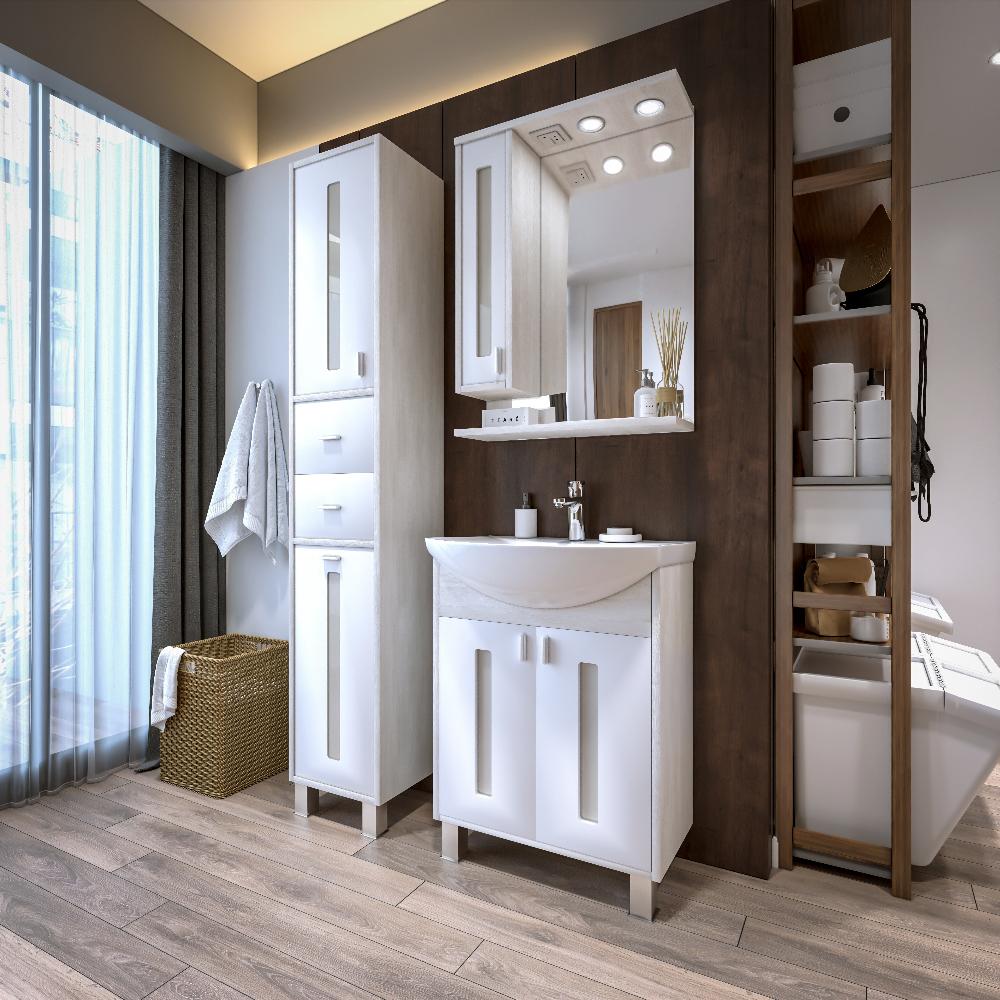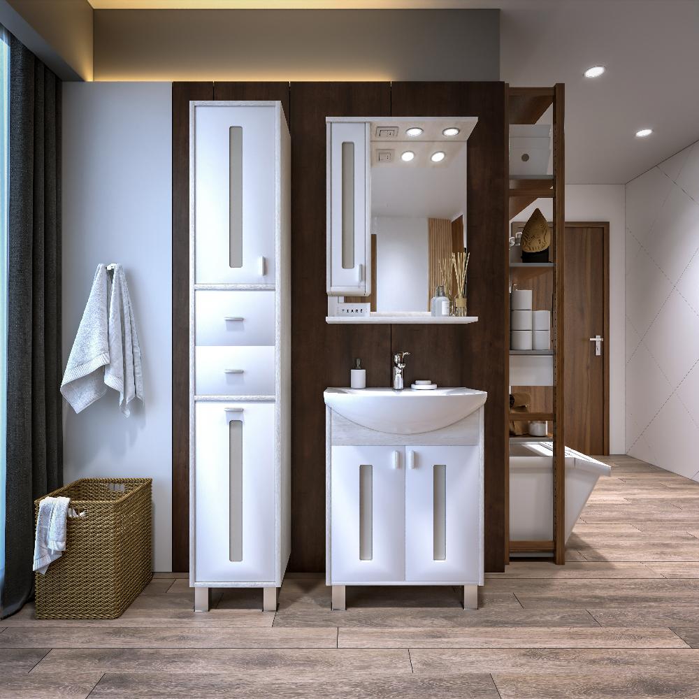 Комплект мебели Бриклаер БАЛИ состоит из: Тумба под раковину напольная Бриклаер БАЛИ правая светлая лиственница/белый, 40 см, Пенал Бриклаер БАЛИ 35 см, светлая лиственница/белый, Раковина Santek Балтика 1.WH11.0.246, 61 см, Зеркало со шкафом Бриклаер БАЛИ 62 см левое, светлая лиственница/белый.