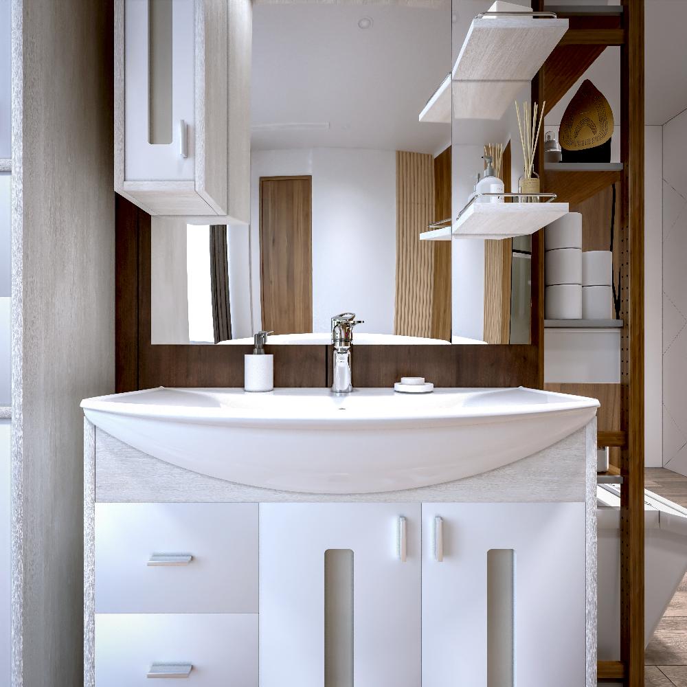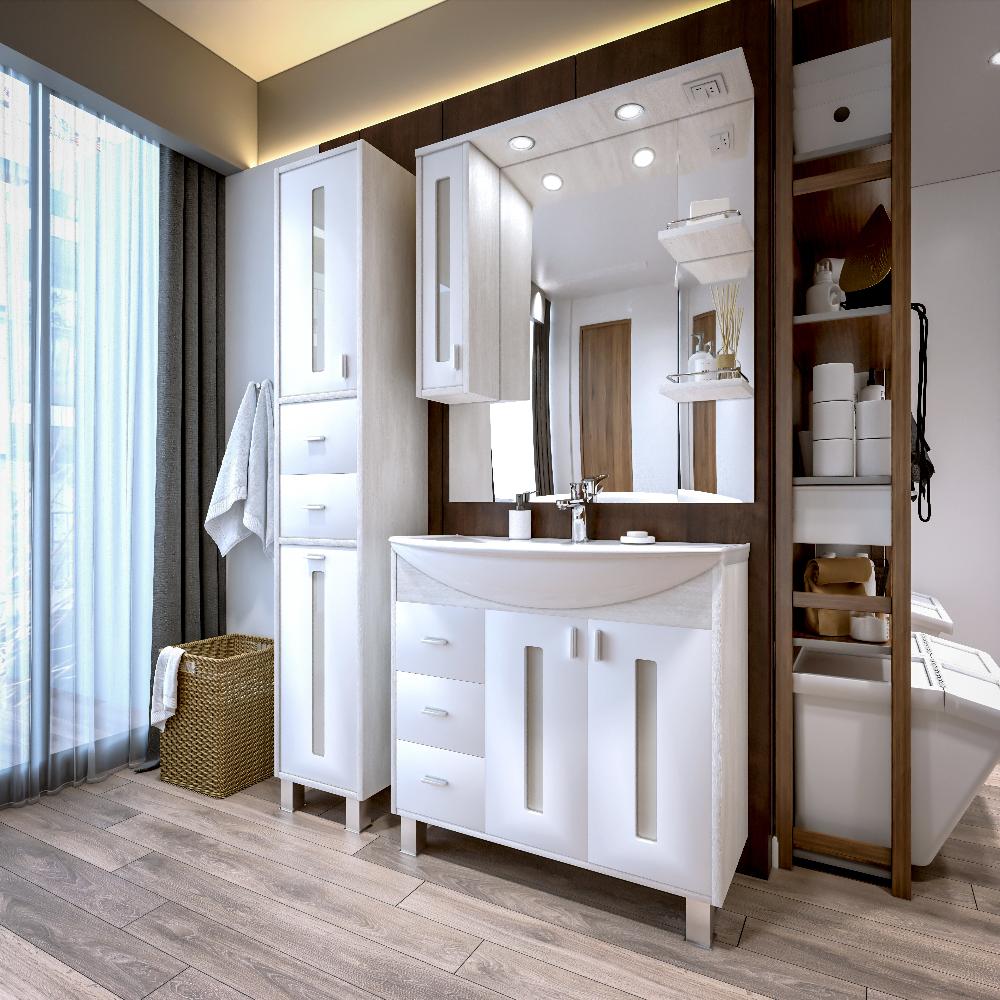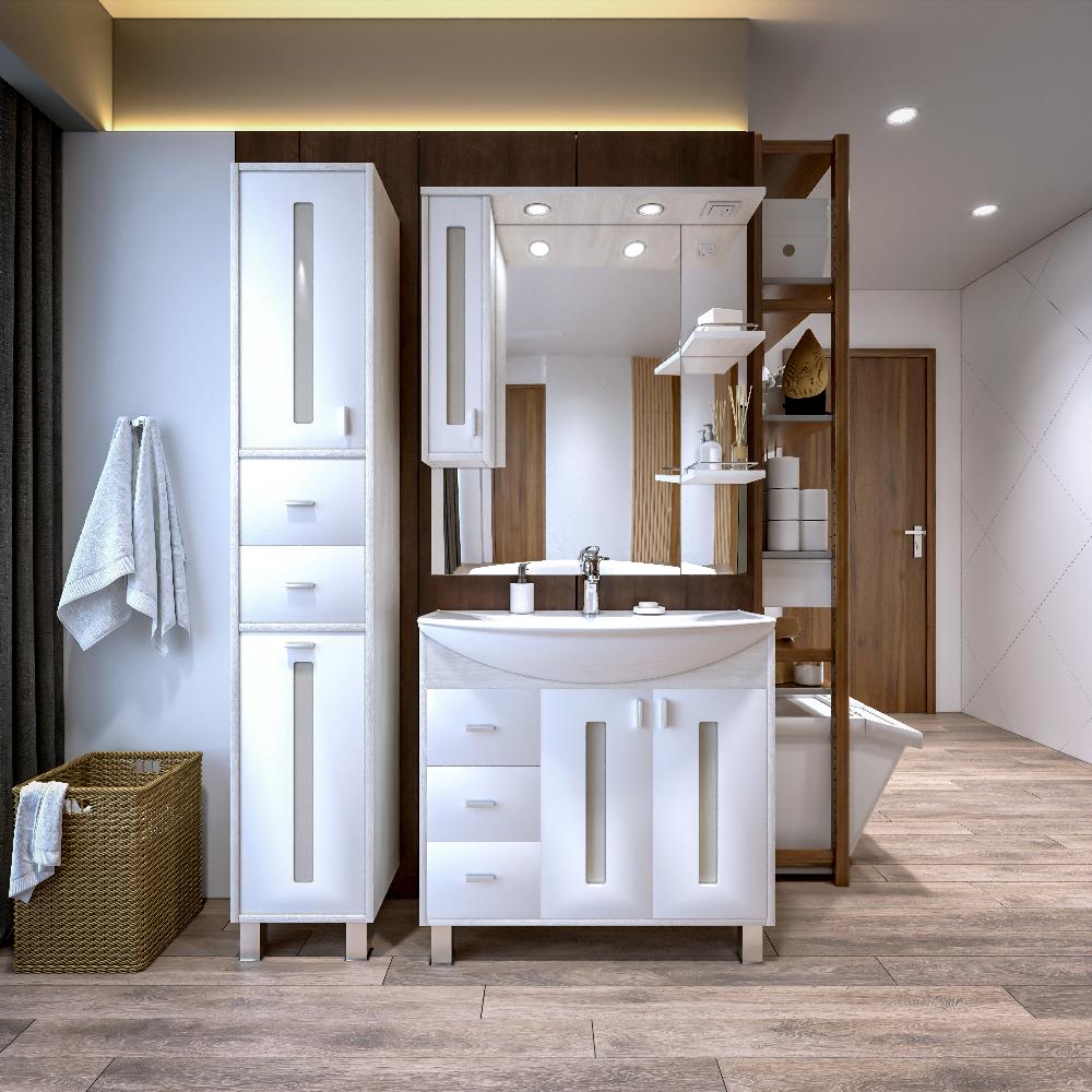 Комплект мебели Бриклаер БАЛИ состоит из: Тумба под раковину напольная Бриклаер БАЛИ светлая лиственница/белый, 85 см, Пенал Бриклаер БАЛИ 35 см, светлая лиственница/белый, Раковина Kirovit Стиль 850, 86,5 см, Зеркало со шкафом Бриклаер БАЛИ 90 см правое, светлая лиственница/белый.