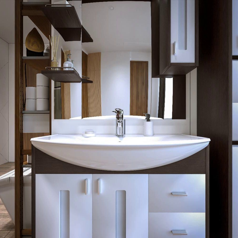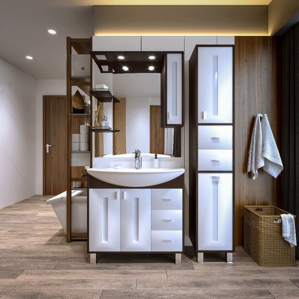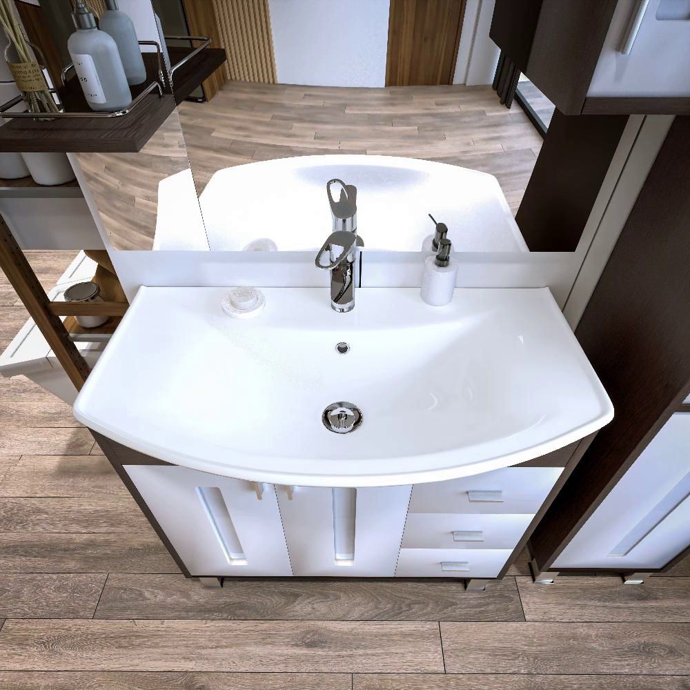 Комплект мебели Бриклаер БАЛИ состоит из: Тумба под раковину напольная Бриклаер БАЛИ венге/белый , 85 см, Пенал Бриклаер БАЛИ 35 см, венге/белый, Раковина Kirovit Стиль 850, 86,5 см, Зеркало со шкафом Бриклаер БАЛИ 90 см правое, венге/белый.