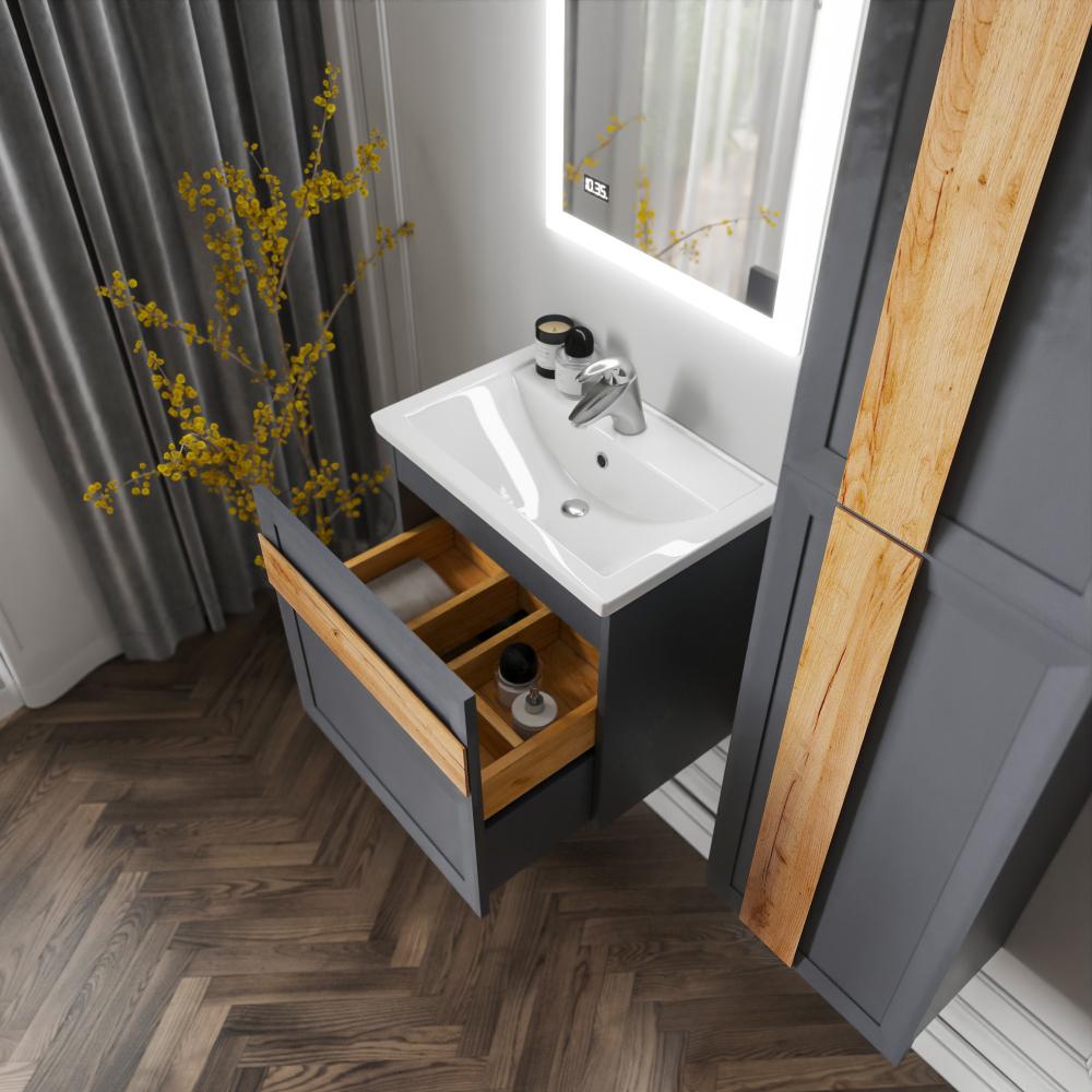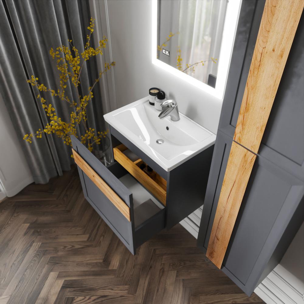 Комплект мебели Бриклаер БЕРЛИН состоит из: Тумба под раковину подвесная Бриклаер БЕРЛИН оникс серый, 60 см, Ручка для тумбы Бриклаер БЕРЛИН 60 см, дуб золотой, Раковина Kirovit Фостер 600, 61 см, Шкаф навесной Бриклаер БЕРЛИН 60 см, оникс серый, Шкаф навесной Бриклаер БЕРЛИН 90 см, оникс серый, Ручка для шкафа Бриклаер БЕРЛИН 60 см, дуб золотой, Ручка для шкафа Бриклаер БЕРЛИН 90 см, дуб золотой, Зеркало Бриклаер Вега/Мальта 75 LED подсветка на взмах руки, часы.