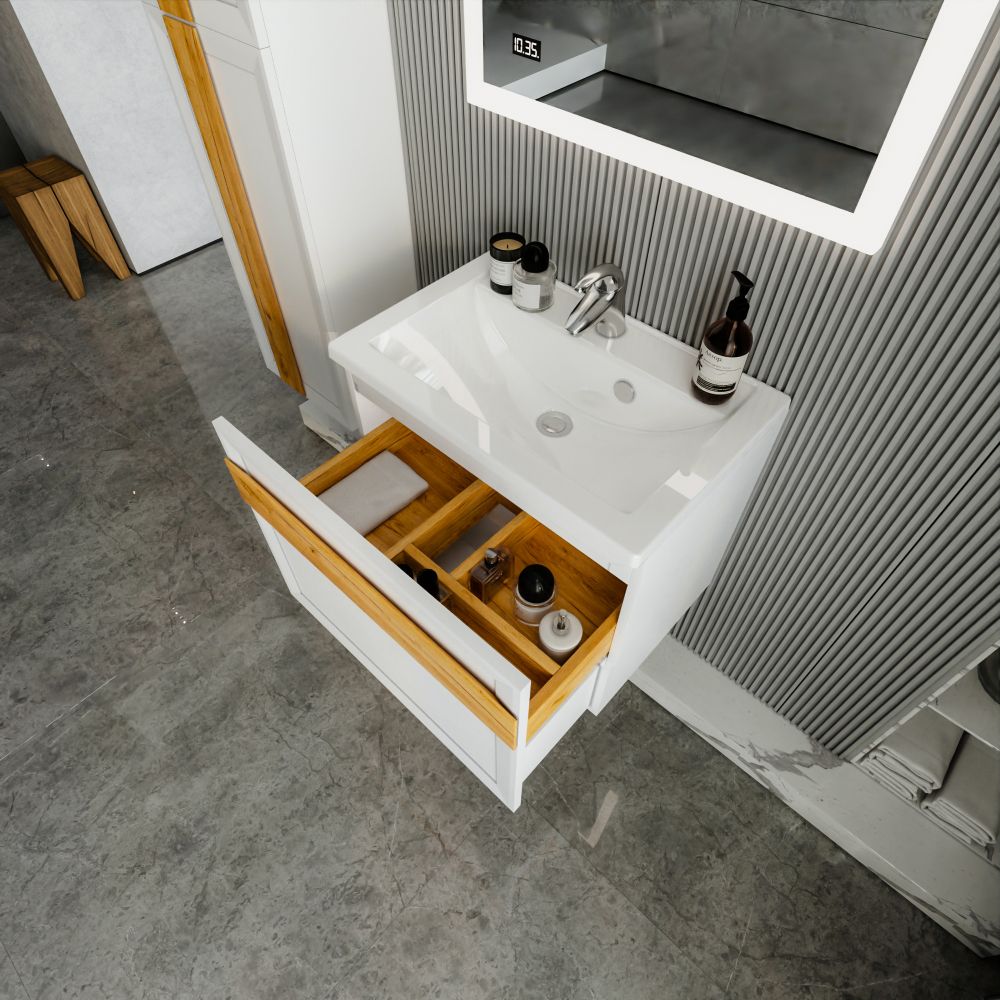 Комплект мебели Бриклаер БЕРЛИН состоит из: Тумба под раковину подвесная Бриклаер БЕРЛИН белый , 70 см, Ручка для тумбы Бриклаер БЕРЛИН 70 см, дуб золотой, Раковина Paola Mario 700, белый, Шкаф навесной Бриклаер БЕРЛИН 60 см, белый, Шкаф навесной Бриклаер БЕРЛИН 90 см, белый, Ручка для шкафа Бриклаер БЕРЛИН 60 см, дуб золотой, Ручка для шкафа Бриклаер БЕРЛИН 90 см, дуб золотой, Зеркало Бриклаер Вега/Мальта 75 LED подсветка на взмах руки, часы.