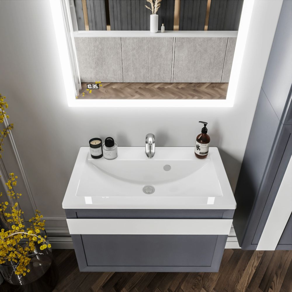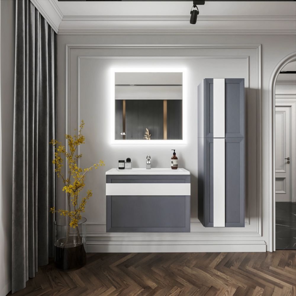 Комплект мебели Бриклаер БЕРЛИН состоит из: Тумба под раковину подвесная Бриклаер БЕРЛИН оникс серый, 80 см, Ручка для тумбы Бриклаер БЕРЛИН 80 см, белый, Раковина Paola Mario 800, белый, Шкаф навесной Бриклаер БЕРЛИН 60 см, оникс серый, Шкаф навесной Бриклаер БЕРЛИН 90 см, оникс серый, Ручка для шкафа Бриклаер БЕРЛИН 60 см, белый, Ручка для шкафа Бриклаер БЕРЛИН 90 см, белый, Зеркало Бриклаер Вега/Мальта 85 LED подсветка на взмах руки, часы.
