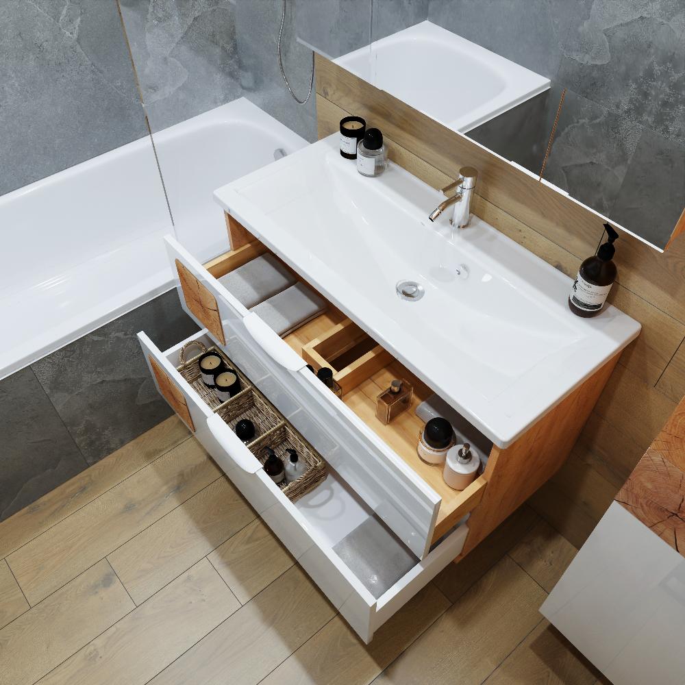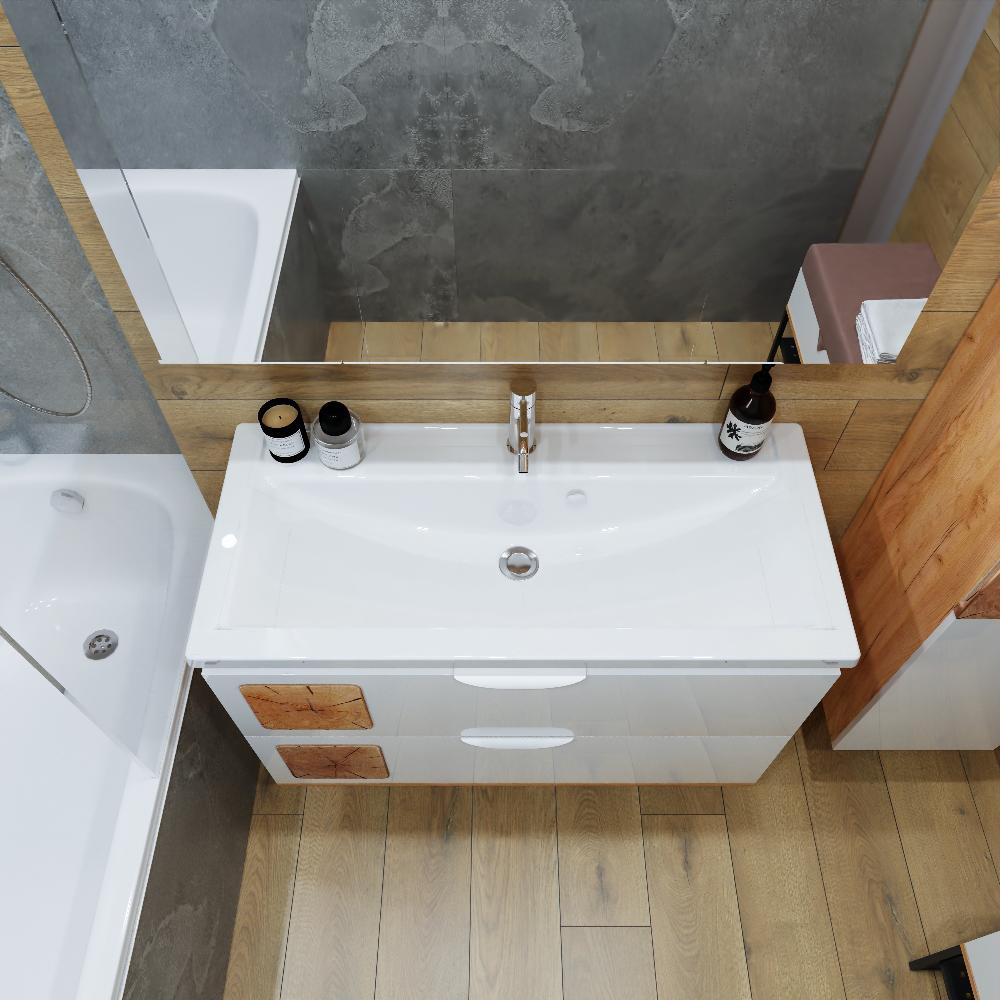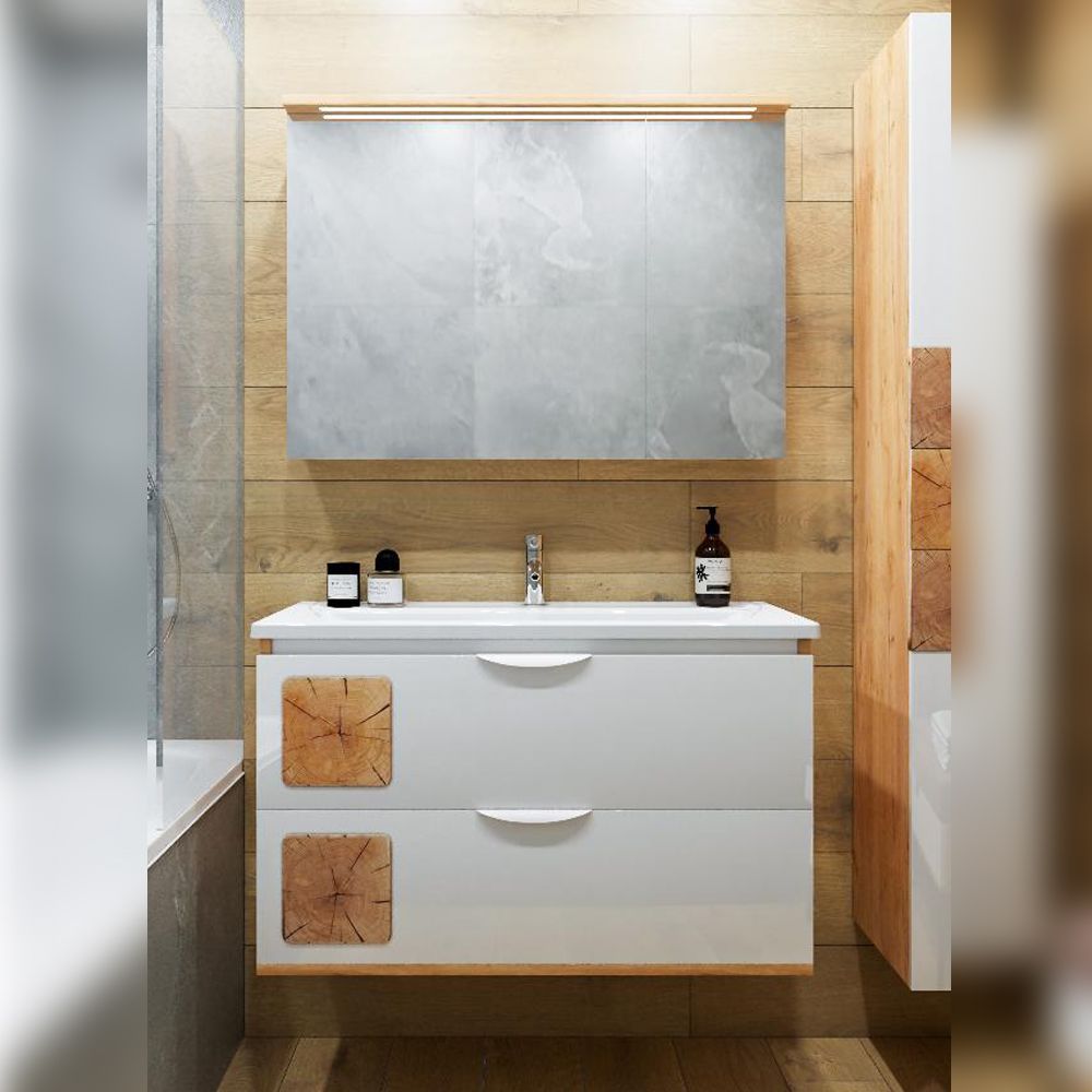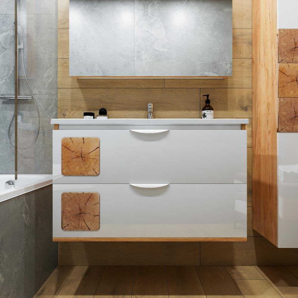 Комплект мебели Бриклаер Форест состоит из: Тумба под раковину подвесная Бриклаер Форест дуб золотой/белый, 100 см, Раковина Kirovit Фостер 1000, 101,2 см, Зеркальный шкаф Бриклаер Форест 100 см, дуб золотой/антрацит.