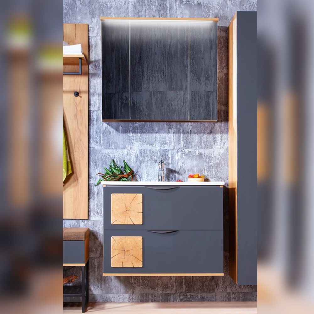 Комплект мебели Бриклаер Форест состоит из: Тумба под раковину подвесная Бриклаер Форест дуб золотой/антрацит, 80 см, Раковина Paola Mario 800, белый, Зеркальный шкаф Бриклаер Форест 80 см, дуб золотой/антрацит.