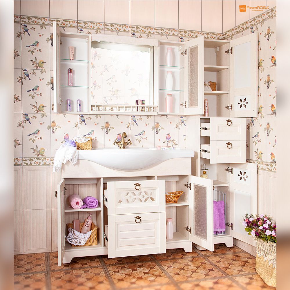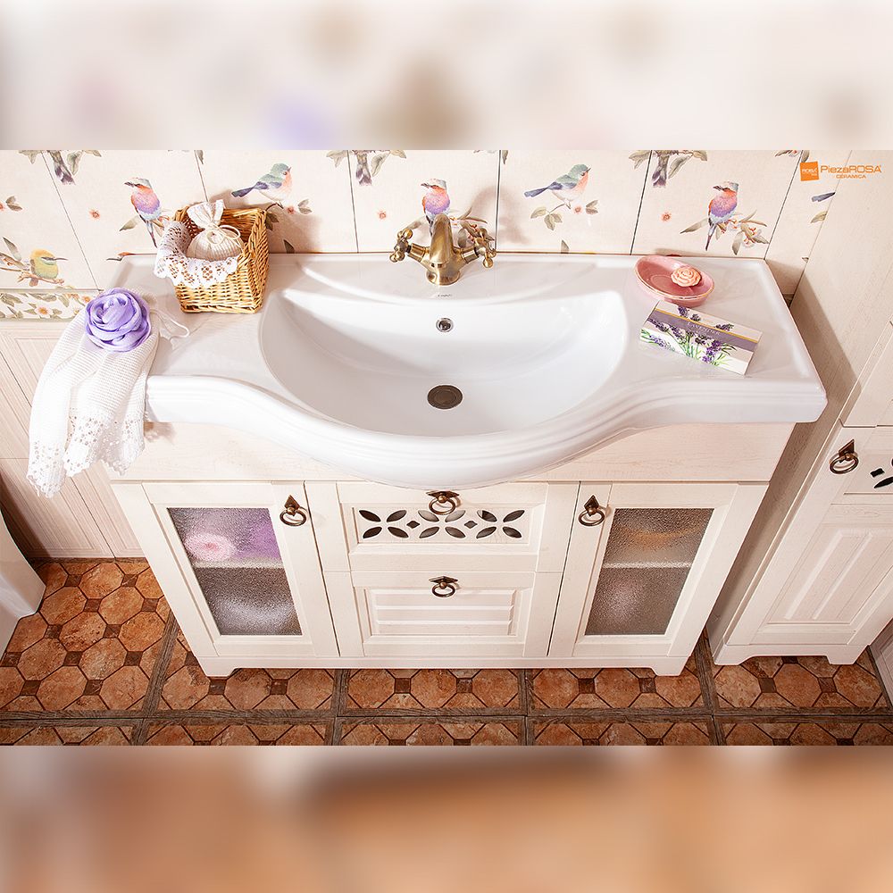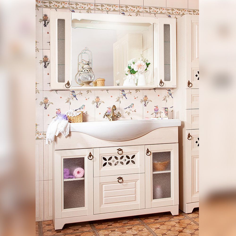 Комплект мебели Бриклаер КАНТРИ состоит из: Тумба под раковину напольная Бриклаер КАНТРИ бежевый дуб прованс, 120 см, Раковина Kirovit Классик, 120 см, Шкаф навесной Бриклаер КАНТРИ 20 см, бежевый дуб прованс 2 шт., Зеркало КАНТРИ 85 см, бежевый дуб прованс.