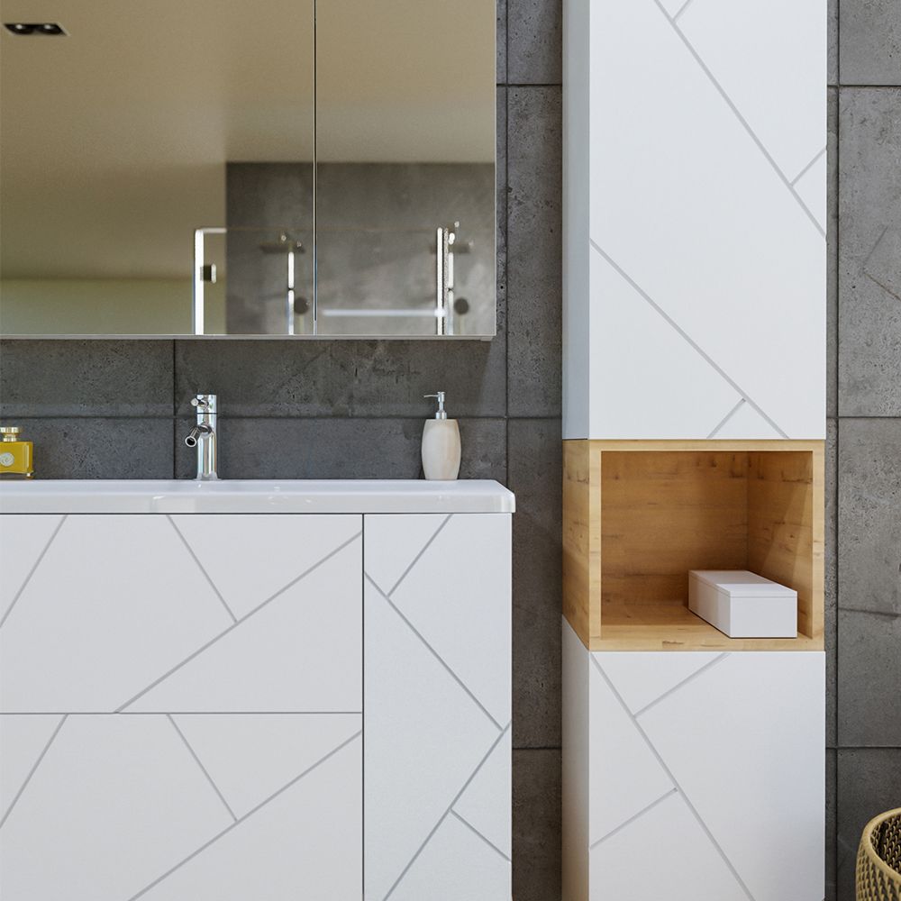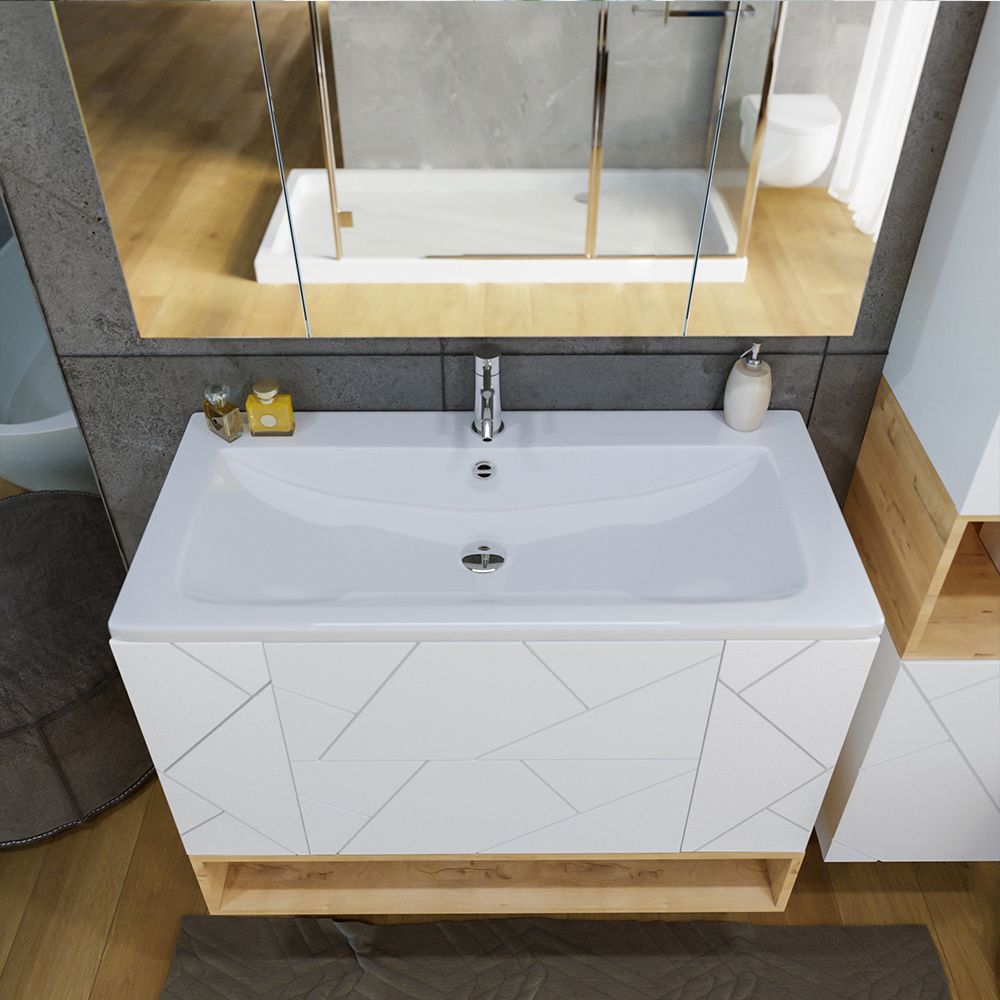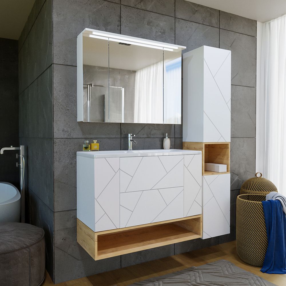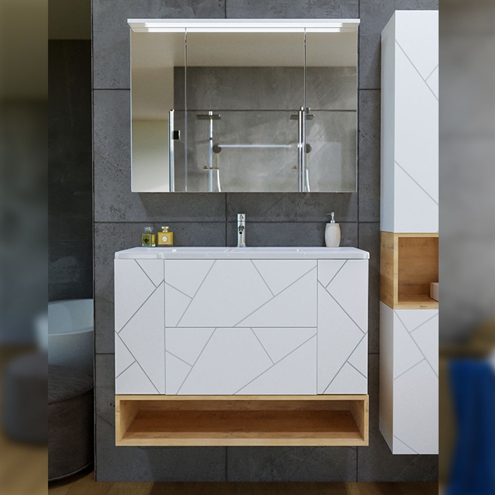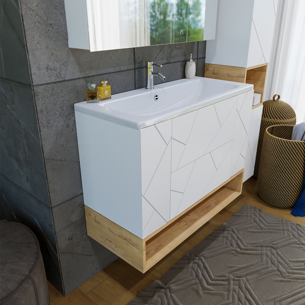 Комплект мебели Бриклаер КРИСТАЛЛ состоит из: Тумба под раковину подвесная Бриклаер КРИСТАЛЛ белый, 100 см, Раковина Kirovit Фостер 1000, 101,2 см, Ниша для тумбы Бриклаер КРИСТАЛЛ 100 см, дуб бунратти, Зеркальный шкаф Бриклаер КРИСТАЛЛ 95 см, белый.