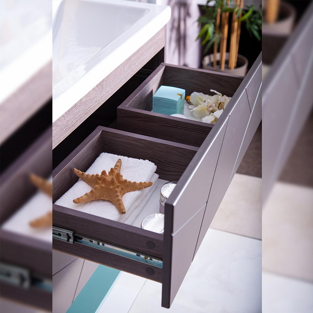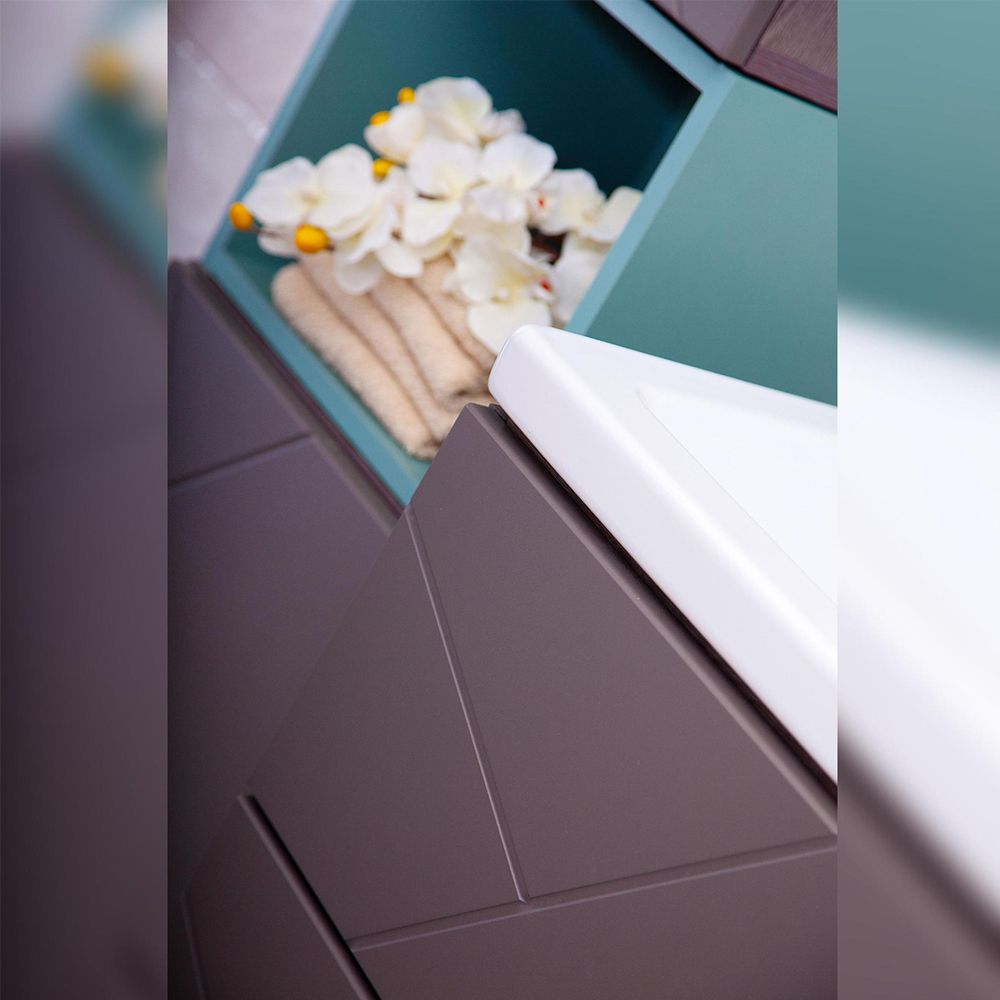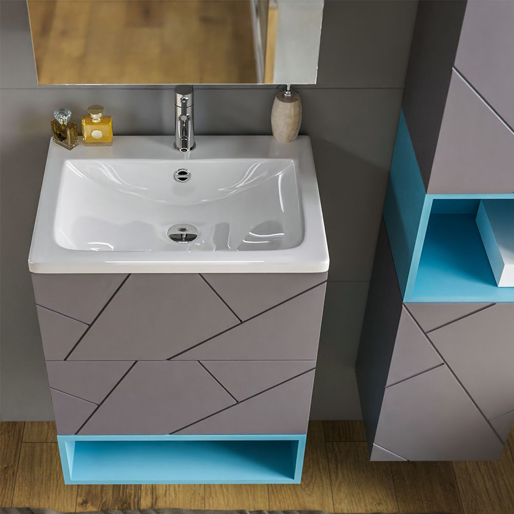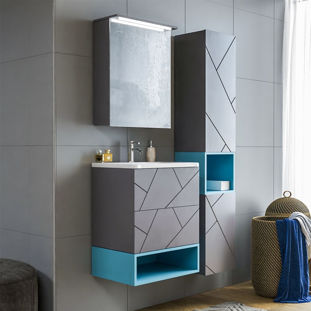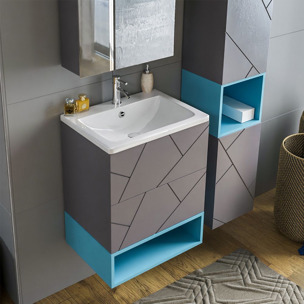 Комплект мебели Бриклаер КРИСТАЛЛ состоит из: Тумба под раковину подвесная Бриклаер КРИСТАЛЛ ясень анкор темный/графит, 60 см, Раковина Cersanit MODUO SLIM UM-MOD60SL/1, 60 см, Ниша для тумбы Бриклаер КРИСТАЛЛ 60 см, муссон, Зеркальный шкаф Бриклаер КРИСТАЛЛ 56 см, ясень анкор темный.