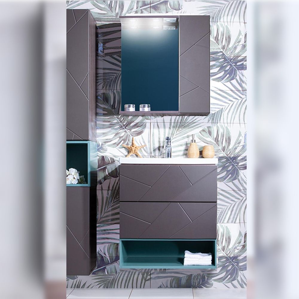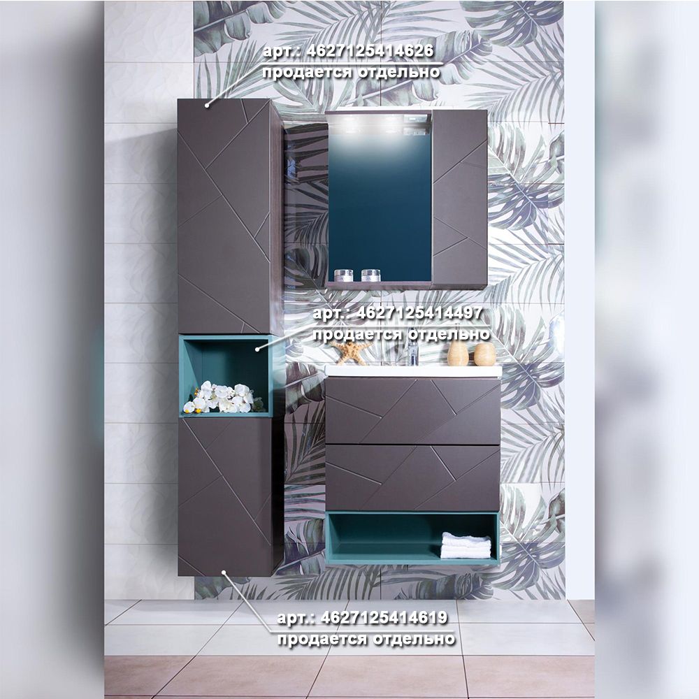Комплект мебели Бриклаер КРИСТАЛЛ состоит из: Тумба под раковину подвесная Бриклаер КРИСТАЛЛ ясень анкор темный/графит, 60 см, Раковина Cersanit MODUO SLIM UM-MOD60SL/1, 60 см, Ниша для тумбы Бриклаер КРИСТАЛЛ 60 см, муссон, Шкаф навесной с дверью Бриклаер КРИСТАЛЛ 20 см, графит, Зеркало Бриклаер КРИСТАЛЛ 40 см, ясень анкор темный.