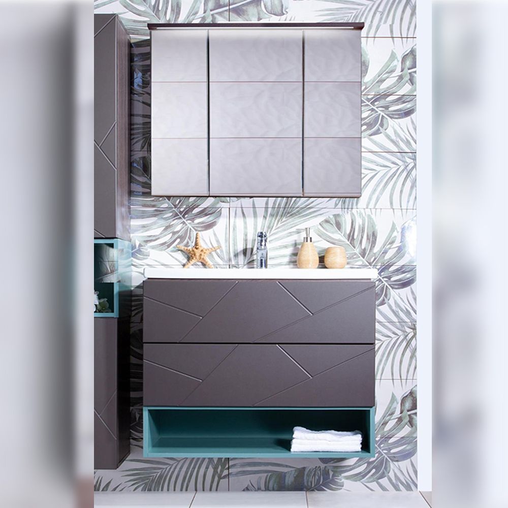 Комплект мебели Бриклаер КРИСТАЛЛ состоит из: Тумба под раковину подвесная Бриклаер КРИСТАЛЛ ясень анкор темный/графит, 80 см, Раковина Cersanit Como UM-COM80/1, 80 см, Ниша для тумбы Бриклаер КРИСТАЛЛ 80 см, муссон, Зеркальный шкаф Бриклаер КРИСТАЛЛ 75 см, ясень анкор темный.