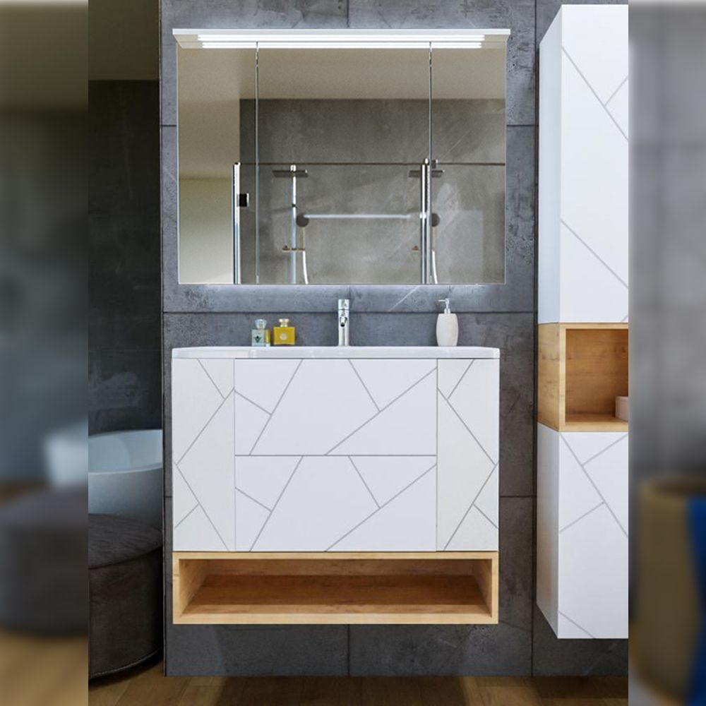 Комплект мебели Бриклаер КРИСТАЛЛ состоит из: Тумба под раковину подвесная Бриклаер КРИСТАЛЛ белый, 90 см, Раковина Paola Alba 900, белый, Ниша для тумбы Бриклаер КРИСТАЛЛ 90 см, дуб бунратти, Зеркальный шкаф Бриклаер КРИСТАЛЛ 95 см, белый.