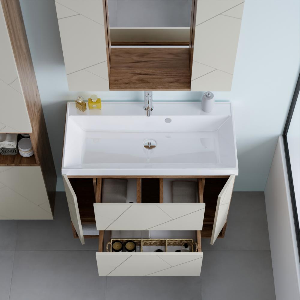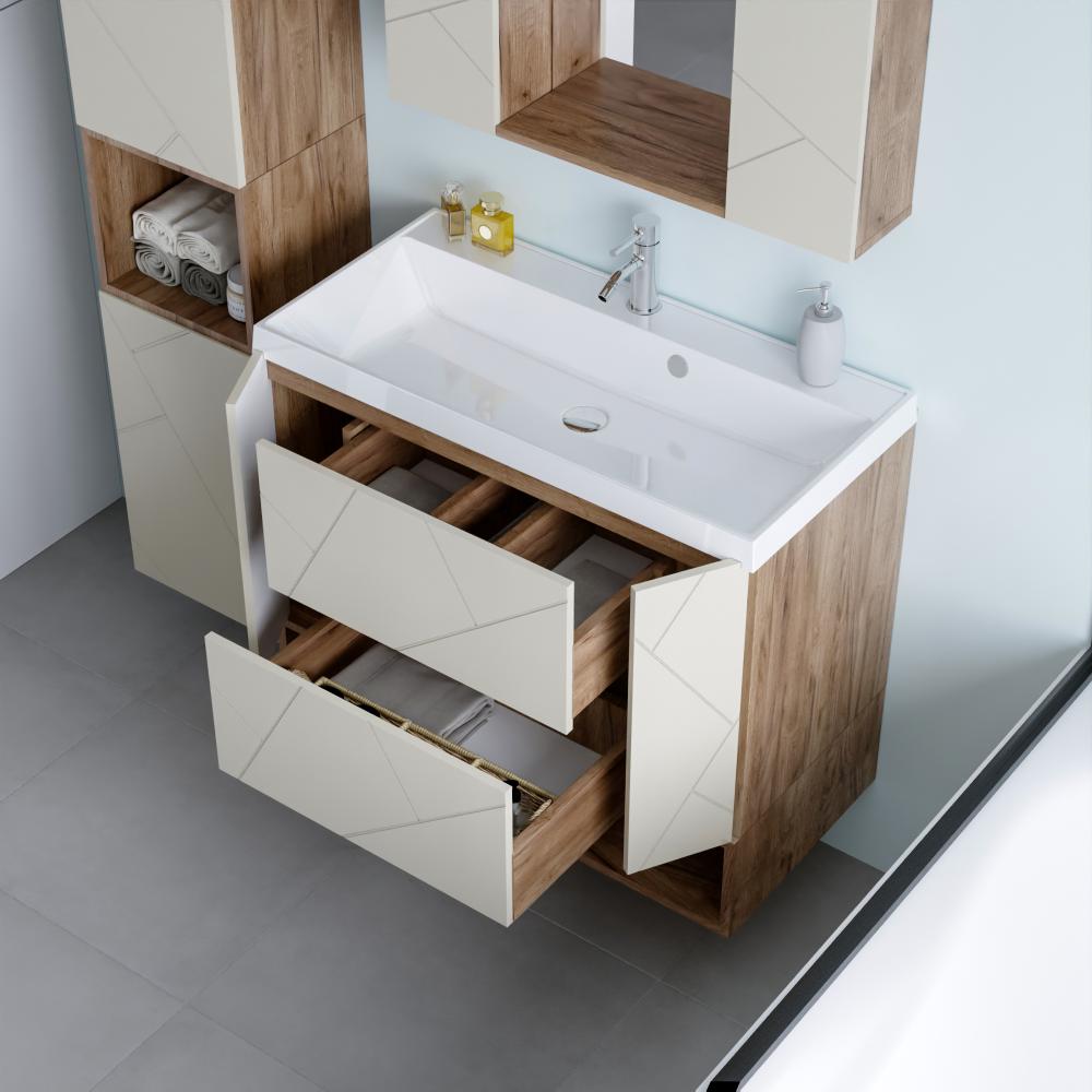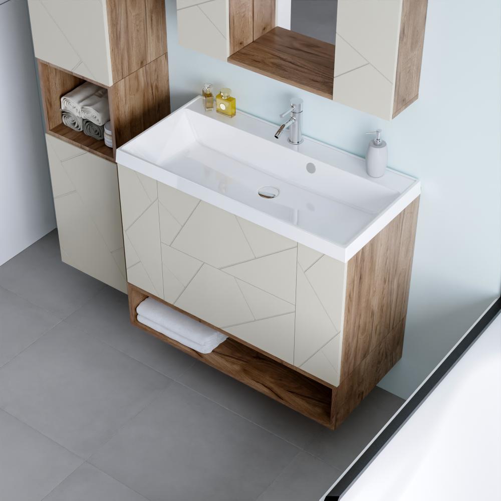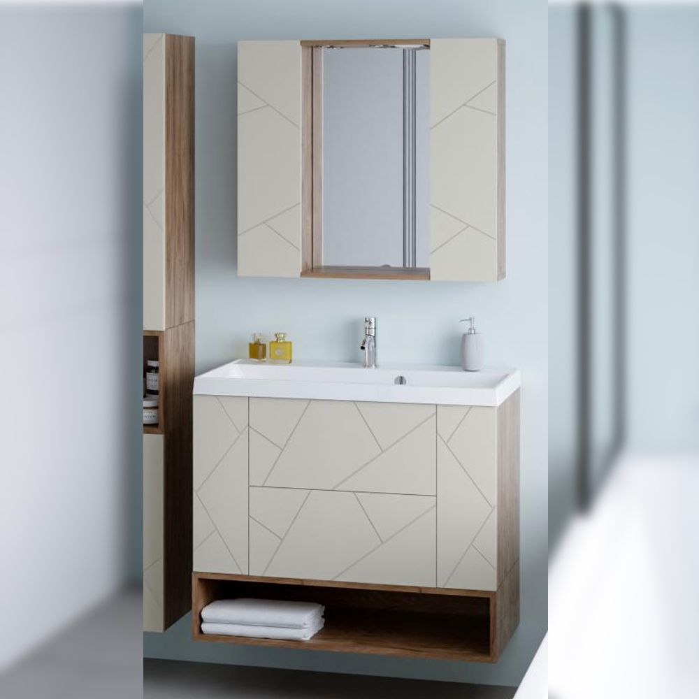 Комплект мебели Бриклаер КРИСТАЛЛ состоит из: Тумба под раковину подвесная Бриклаер КРИСТАЛЛ латте, 90 см, Раковина Paola Alba 900, белый, Ниша для тумбы Бриклаер КРИСТАЛЛ 90 см, дуб крафт табачный, Зеркало Бриклаер КРИСТАЛЛ 40 см, дуб крафт табачный, Шкаф навесной с дверью Бриклаер КРИСТАЛЛ 20 см, латте 2 шт..