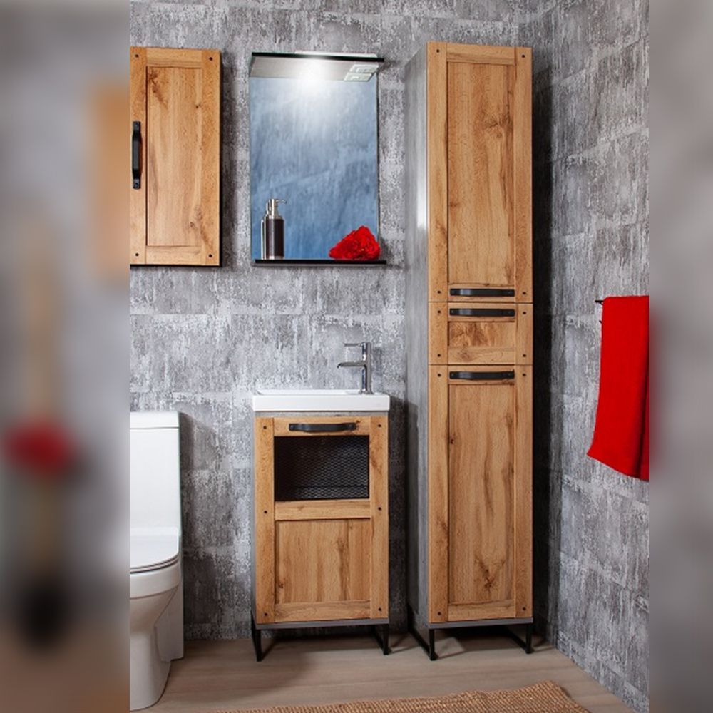Комплект мебели Бриклаер ЛОФТ состоит из: Тумба под раковину напольная Бриклаер ЛОФТ метрополитен грей, 45 см, Раковина Kirovit Фостер 450, 45 см, Зеркало Бриклаер ЛОФТ 45 см, метрополитен грей, Пенал Бриклаер ЛОФТ 34 см, метрополитен грей.