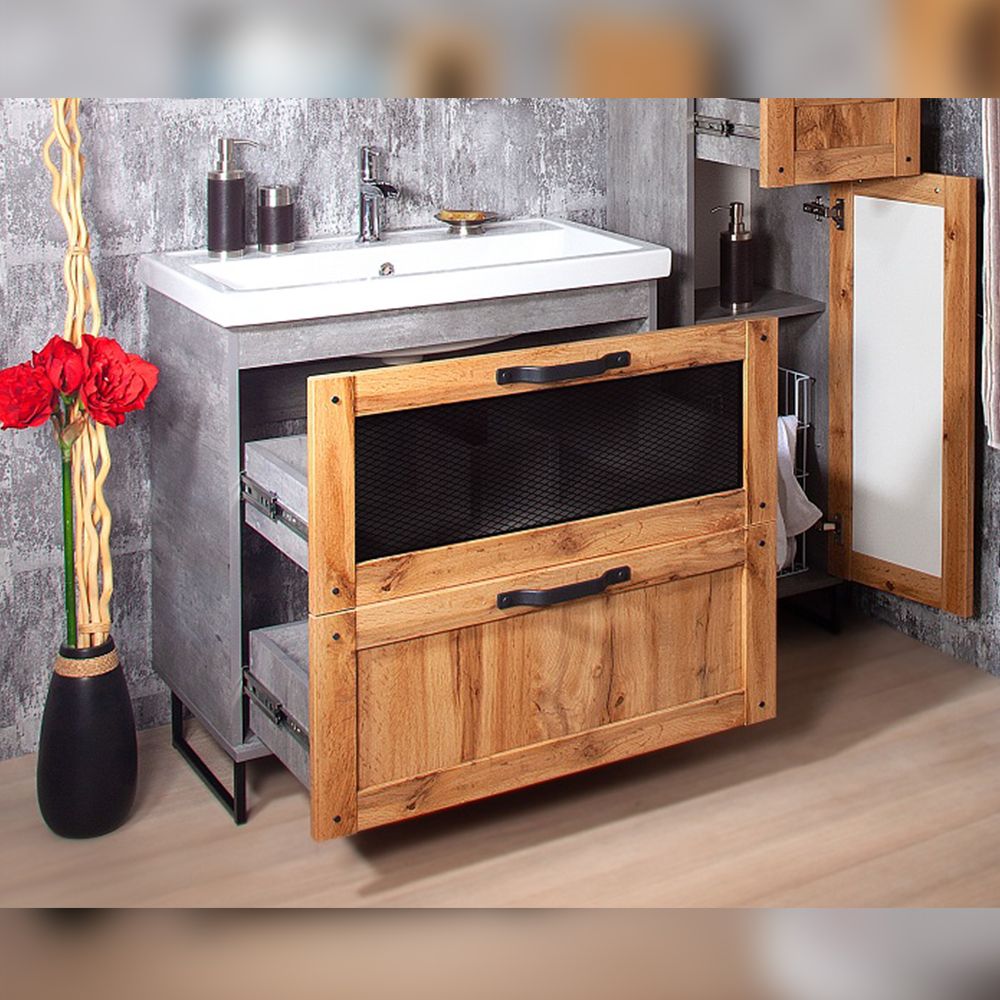Комплект мебели Бриклаер ЛОФТ состоит из: Тумба под раковину напольная Бриклаер ЛОФТ метрополитен грей, 60 см, Раковина Kirovit Фостер 600, 61 см, Зеркало Бриклаер ЛОФТ 45 см, метрополитен грей, Шкаф навесной Бриклаер ЛОФТ 20 см, метрополитен грей.