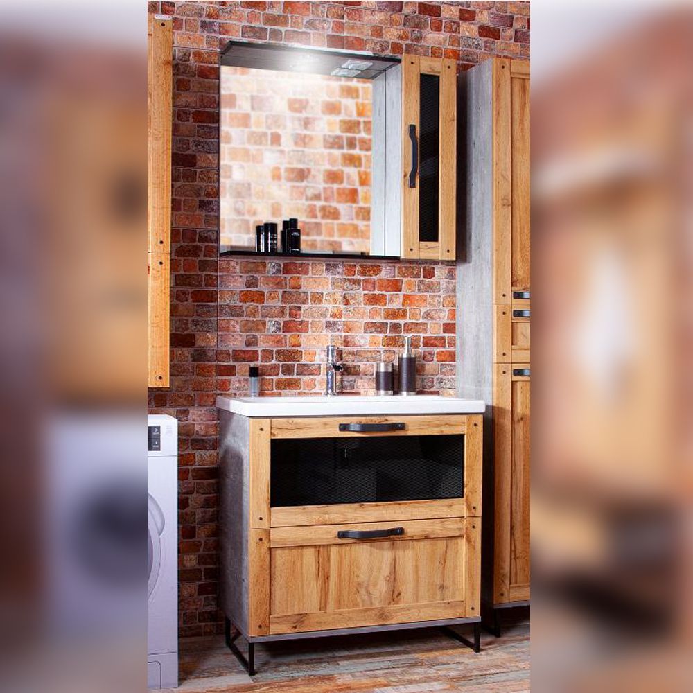 Комплект мебели Бриклаер ЛОФТ состоит из: Тумба под раковину напольная Бриклаер ЛОФТ метрополитен грей, 80 см, Раковина Kirovit Фостер 800, 81,5 см, Зеркало Бриклаер ЛОФТ 60 см, метрополитен грей, Шкаф навесной Бриклаер ЛОФТ 20 см, метрополитен грей.