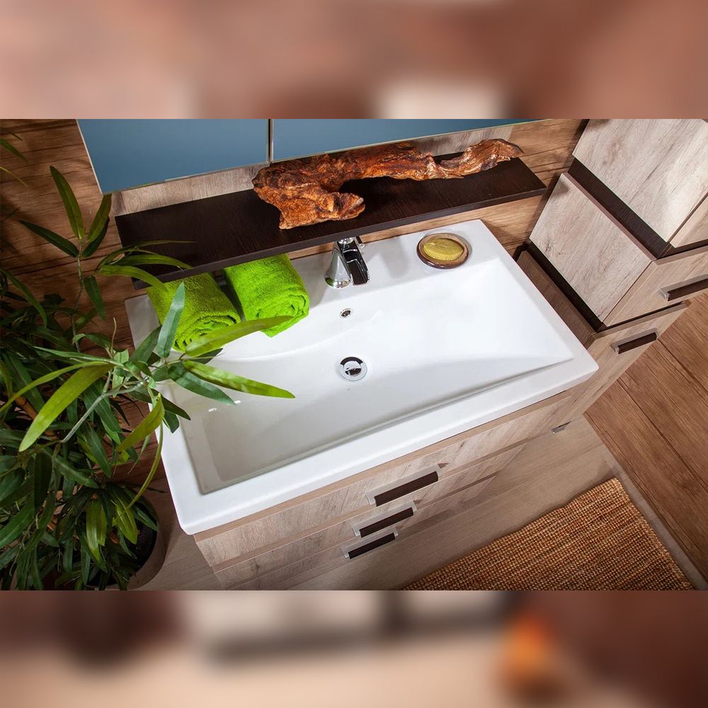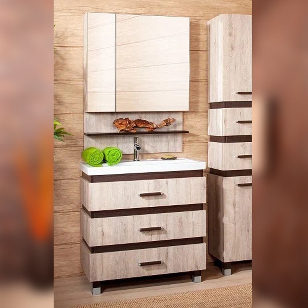 Комплект мебели Бриклаер ТЕХАС состоит из: Тумба под раковину напольная Бриклаер ТЕХАС кантри/венге, 80 см, Раковина Kirovit Фостер 800, 81,5 см, Зеркальный шкаф Бриклаер ТЕХАС 75 см, кантри/венге.