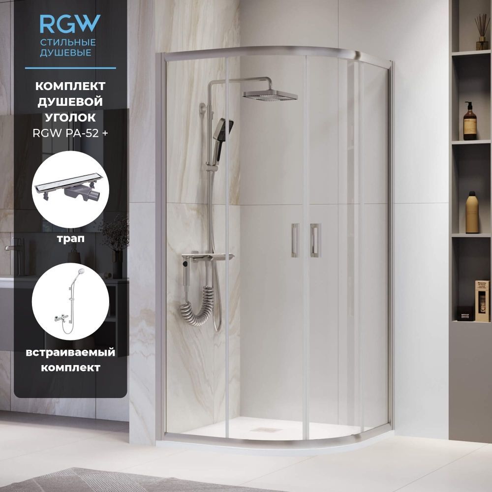 Комплект Душевой уголок RGW PA-52 900x900 + Душевой трап двухсторонний линейный, хром RGW SDR-22 + Душевая стойка RGW SP-23