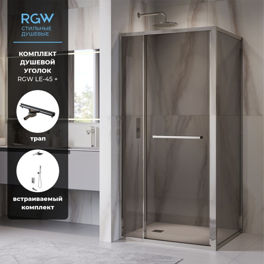 Комплект прямоугольник: Душевой уголок с открытием двери вовнутрь RGW LE-45 1200x900 + Душевой трап RGW SDR-60 + Душевая система скрытого монтажа RGW SP-56