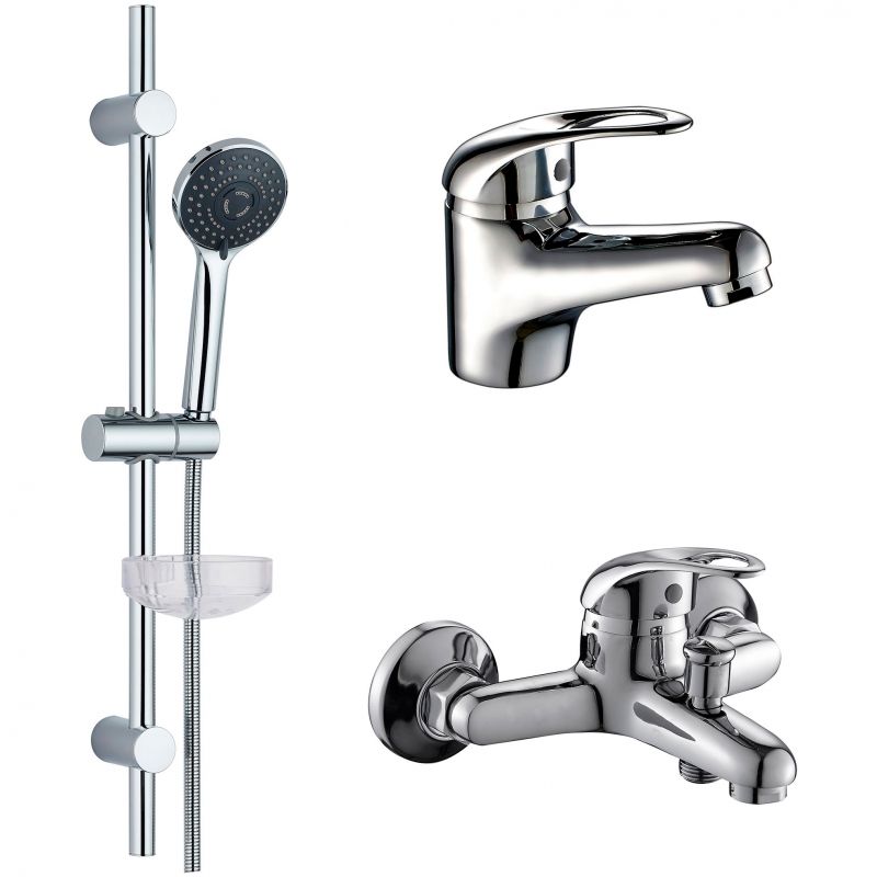 В комплекте поставки: смеситель для ванны, смеситель для раковины, душевая штанга, ручной душ, шланг, держатель лейки, мыльница.