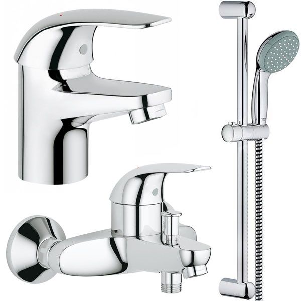 Комплект смесителей Grohe Euroeco 124428. Состоит из душевого гарнитура, смесителя для ванны и смесителя для раковины.