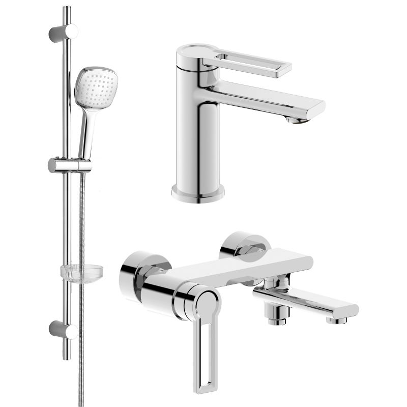 В комплекте поставки: смеситель для ванны, смеситель для раковины, душевая штанга, ручной душ, шланг, держатель лейки, мыльница.