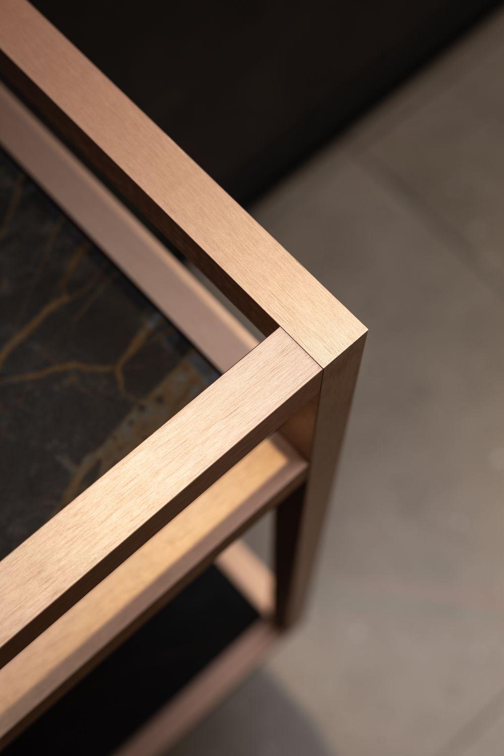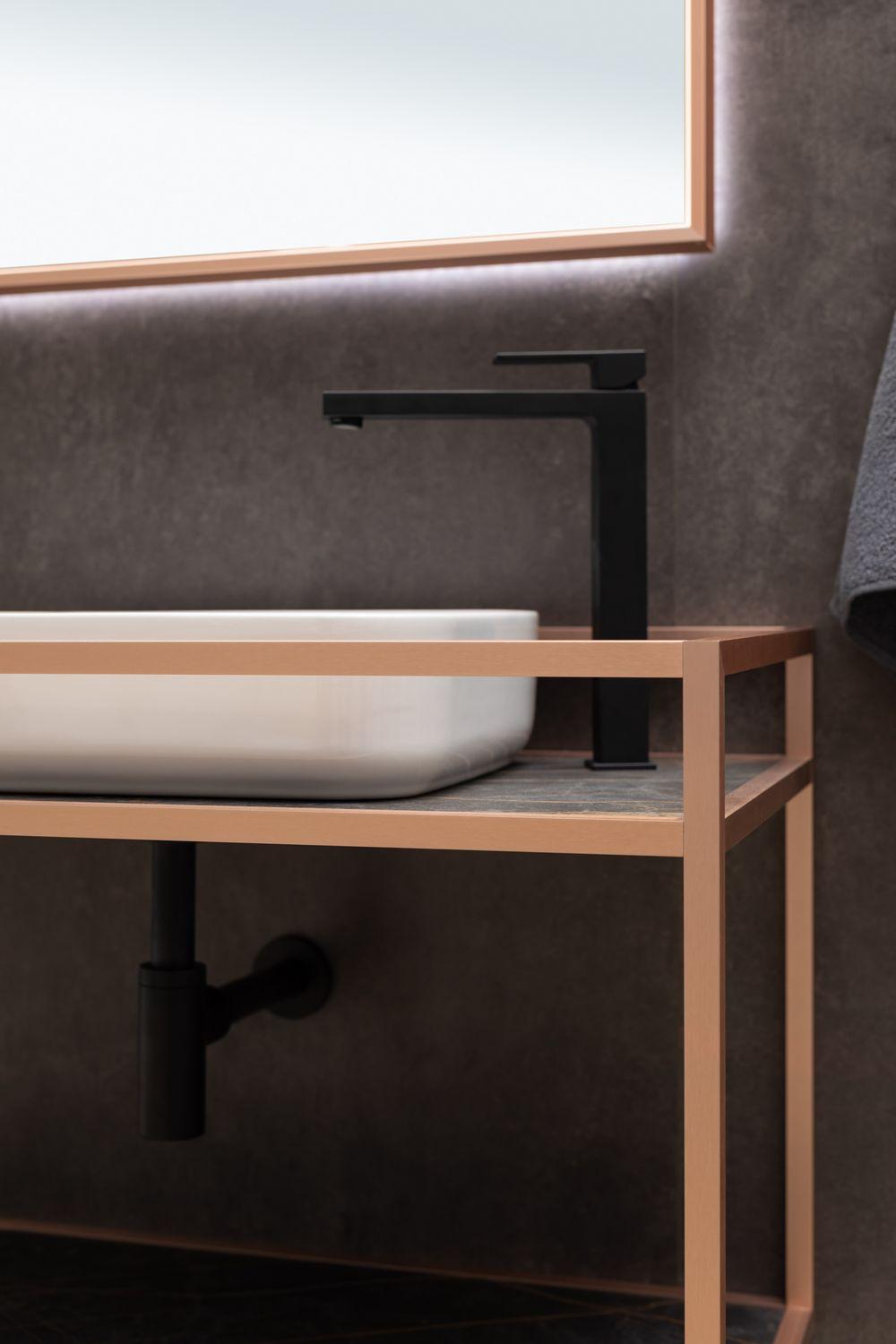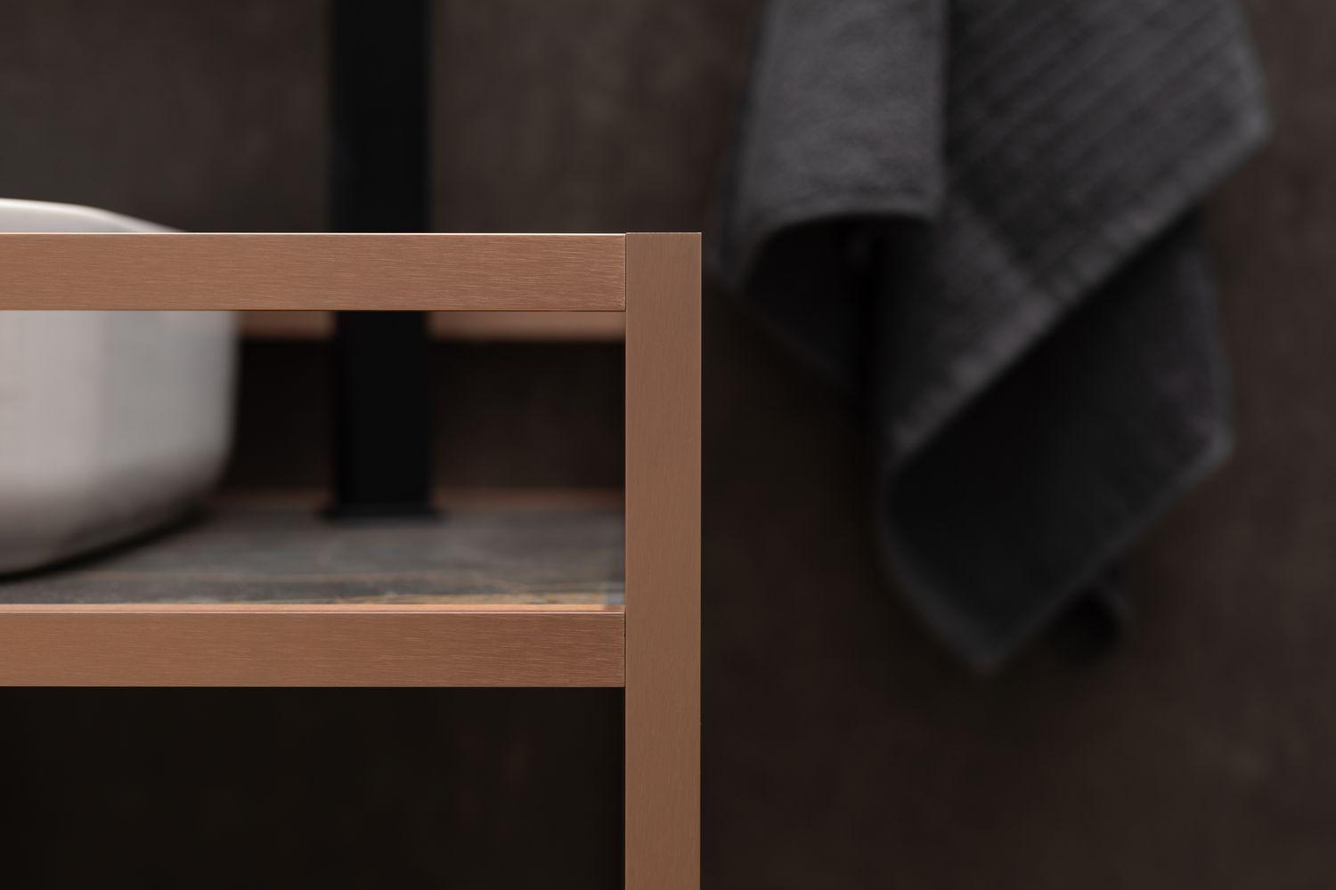 Стильные каркасы тумб и пеналов выполнены из металла, имеют брашированную поверхность