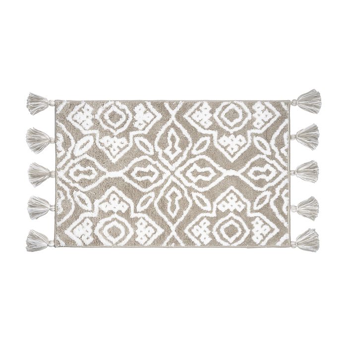 Мягкий бежевый коврик для ванной с декоративными пушистыми кисточками и белым узором, очень приятный на ощупь. Ворс из микрофибры отлично держит форму, легко чистится и быстро сохнет. Коврик подойдет для ванной и туалета, а также поможет создать уют в спальне или гостиной.