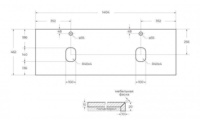 С фрезерованными ручками по всей длине фасада; раковина сифоном не комплектуется