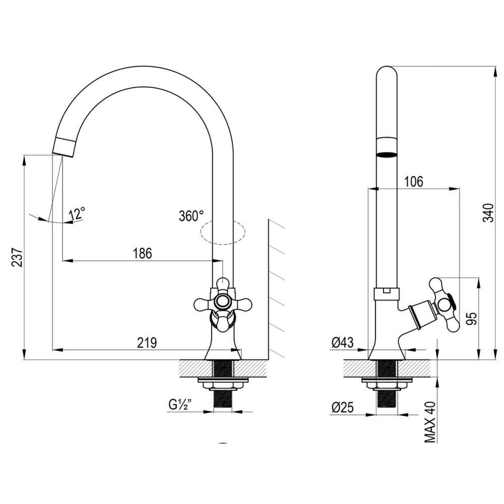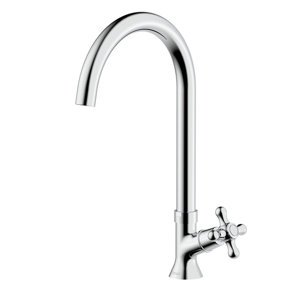 Корпус крана с высоким поворотным изливом с аэратором, кран-буксой с керамическими пластинами и металлической рукояткой Присоединительная группа для настольного крепления |