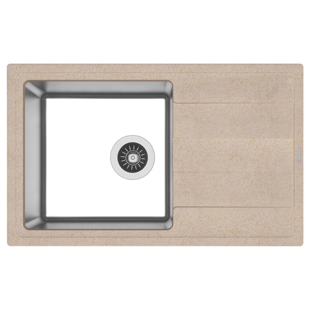 Мойка под шкаф 60 см. Материал столешницы мойки - кварцевый композит. Материал чаши мойки - нержавеющая сталь марки AISI 304, толщина 1 мм. В комплект входит отводная арматура с выпуском 3 ½ ” (D=90 мм) и переливом, набор крепежей, трафарет. Модель оборачиваемая.