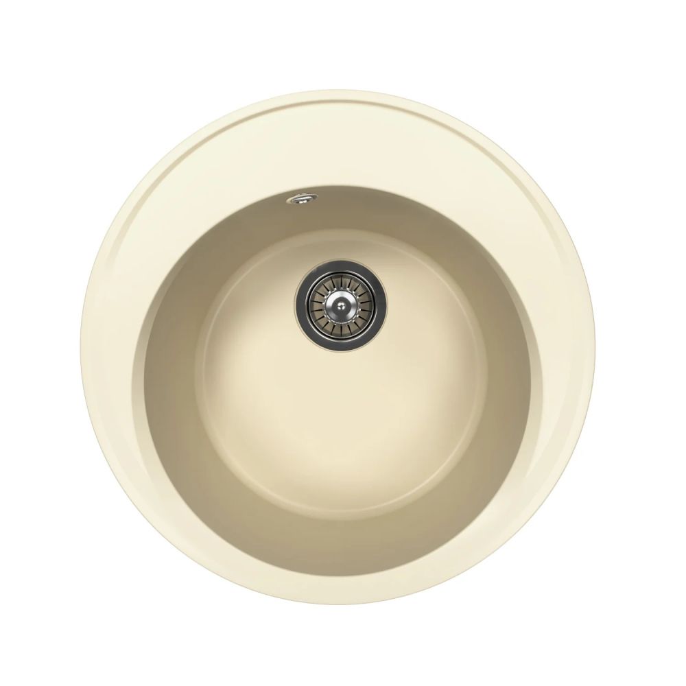 Круглая мойка с большой чашей для кухонного шкафа 45 см. Материал — кварцевый композит. Предусмотрены дополнительные отверстия для установки аксессуаров.