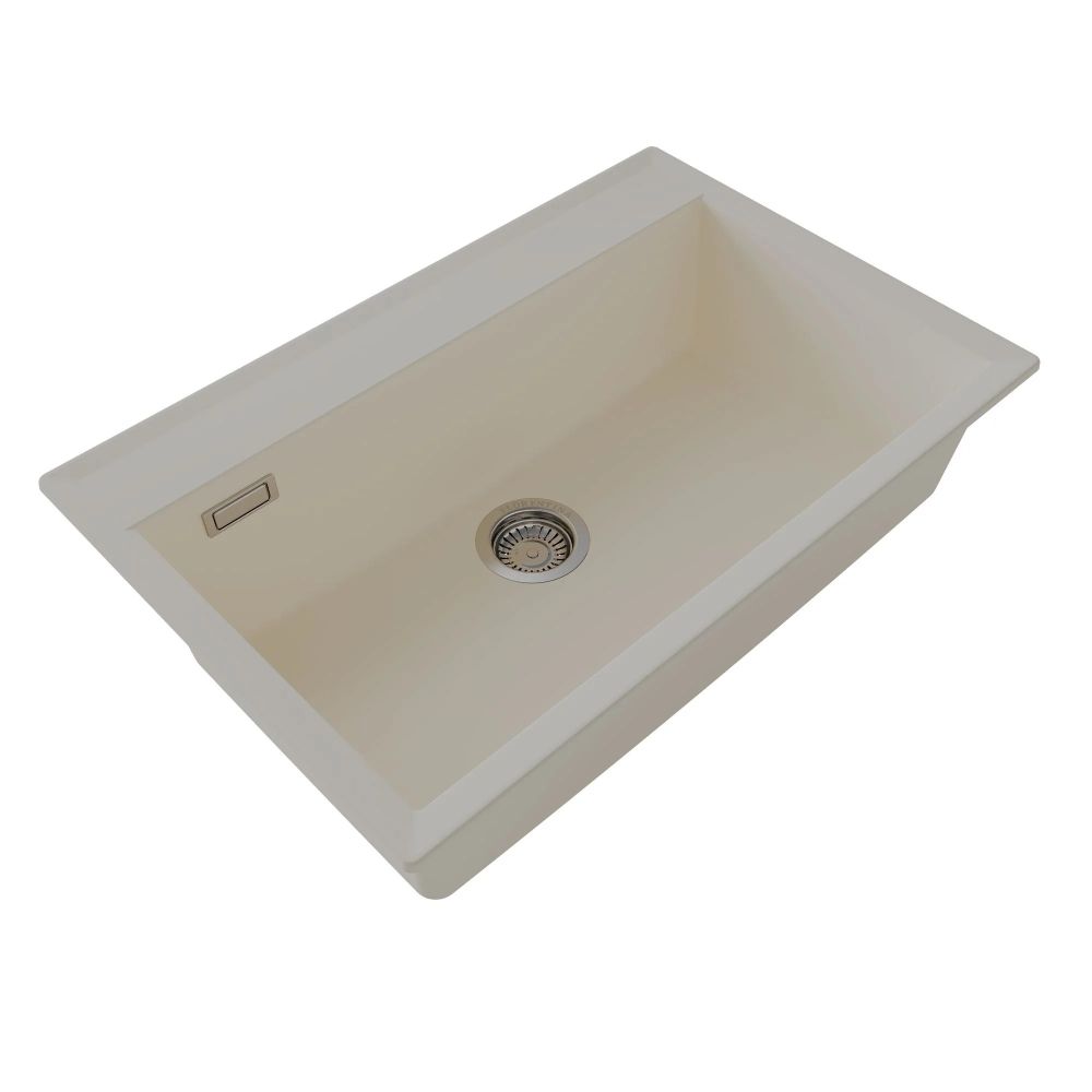 Прямоугольная мойка с большой чашей для кухонного шкафа 80 см. Материал — кварцевый композит. Предусмотрены доп. отверстия для установки аксессуаров.