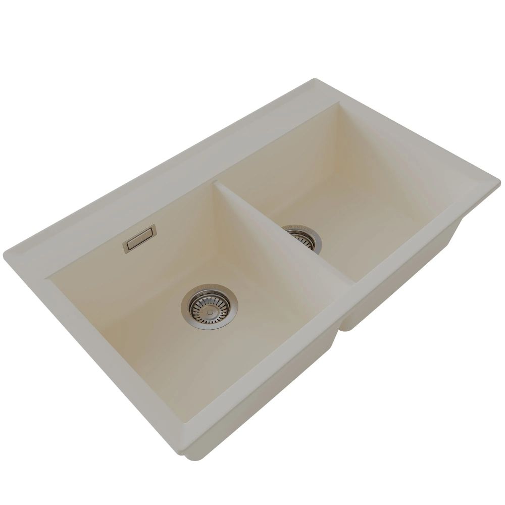 Прямоугольная мойка с двумя большими чашами для кухонного шкафа 80 см. Материал — кварцевый композит. Предусмотрены доп. отверстия для установки аксессуаров.