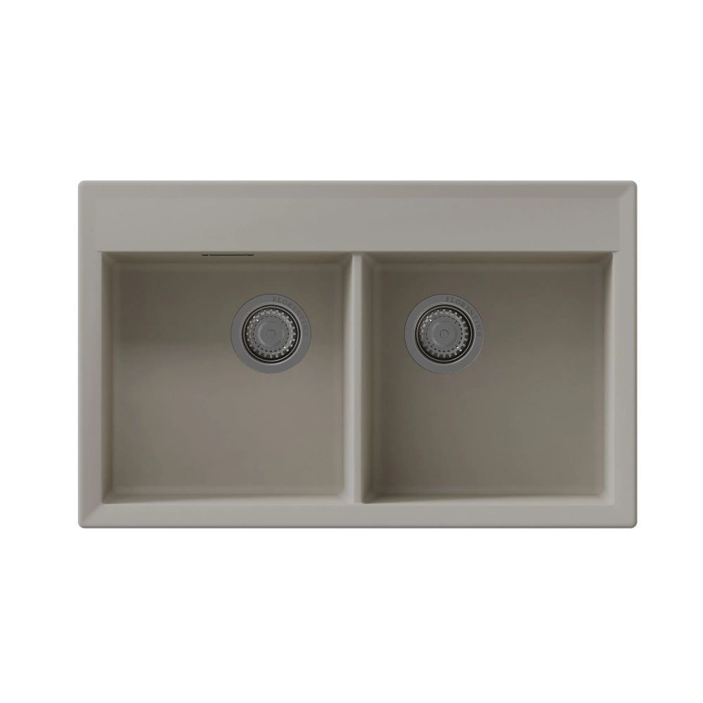 Прямоугольная мойка с двумя большими чашами для кухонного шкафа 80 см. Материал — кварцевый композит. Предусмотрены доп. отверстия для установки аксессуаров.