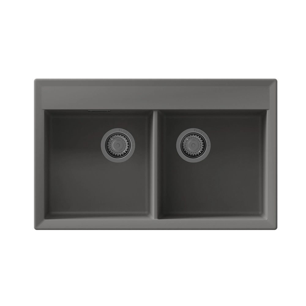 Прямоугольная мойка с двумя большими чашами для кухонного шкафа 80 см. Материал — кварцевый композит. Предусмотрены доп. отверстия для установки аксессуаров.