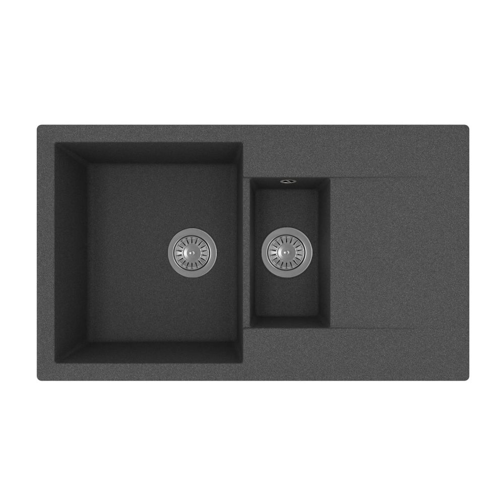 Прямоугольная мойка с большой и малой чашами для кухонного шкафа 60 см. Материал — кварцевый композит. Предусмотрены доп. отверстия для установки аксессуаров.