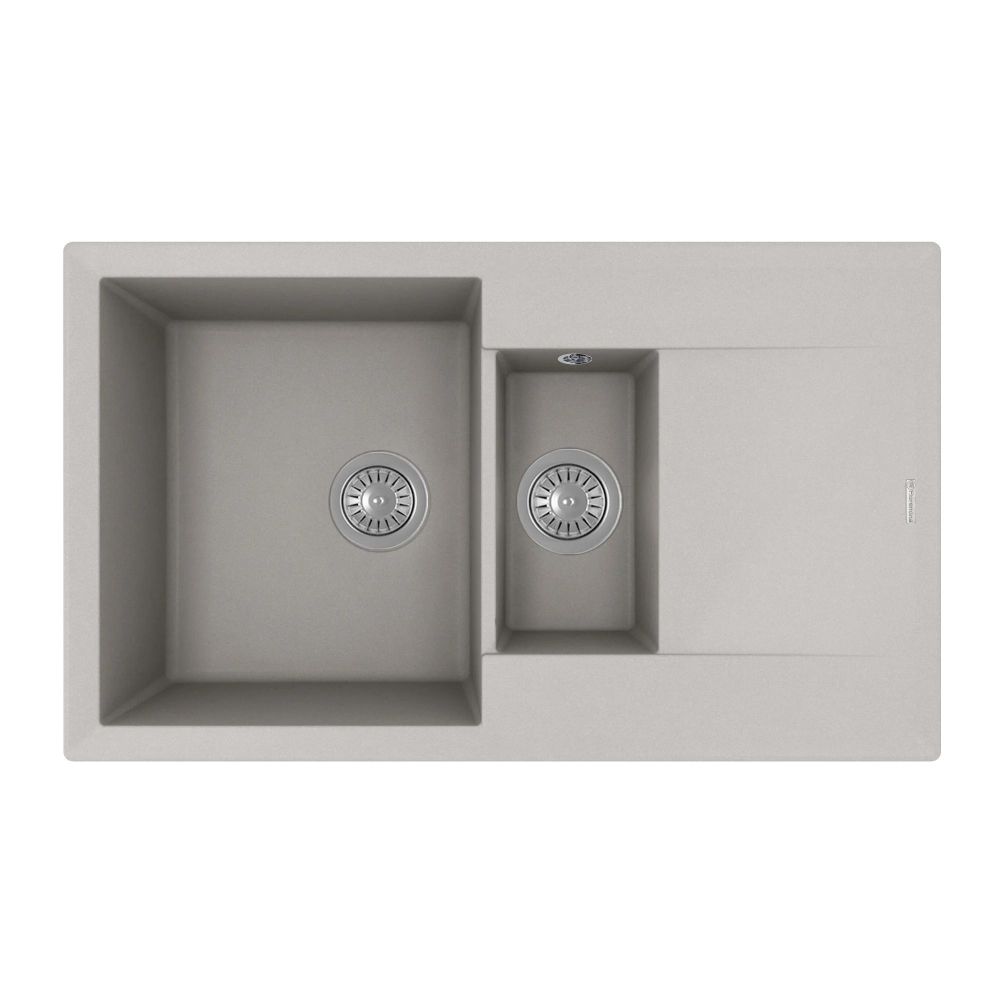 Прямоугольная мойка с большой и малой чашами для кухонного шкафа 60 см. Материал — кварцевый композит. Предусмотрены доп. отверстия для установки аксессуаров.