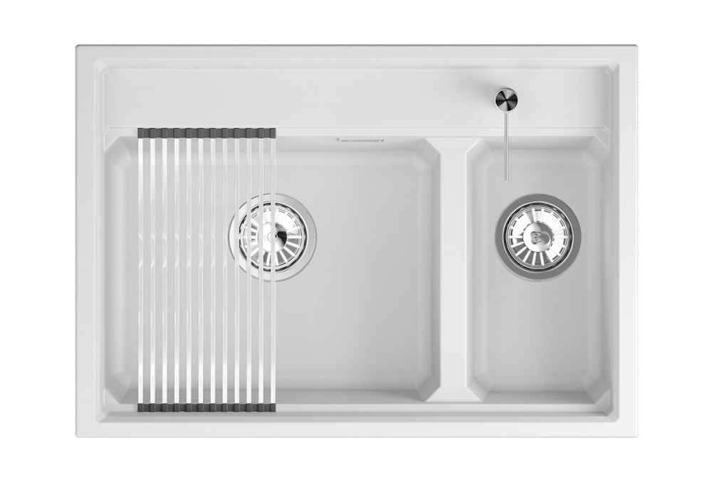 Мойка Granula с двумя чашами - идеальное решение для эффективной работы на кухне! Широкая чаша для мытья большой посуды, узкая чаша - для ополаскивания и мойки фруктов, овощей и мелкой посуды. Материал - кварцевый песок, прочный и износостойкий. Форма чаши адаптирована под функциональный ролл-мат. Мойка легко моется и устойчива к высоким температурам. В комплекте: ролл-мат, дозатор жидкого мыла, сифон.