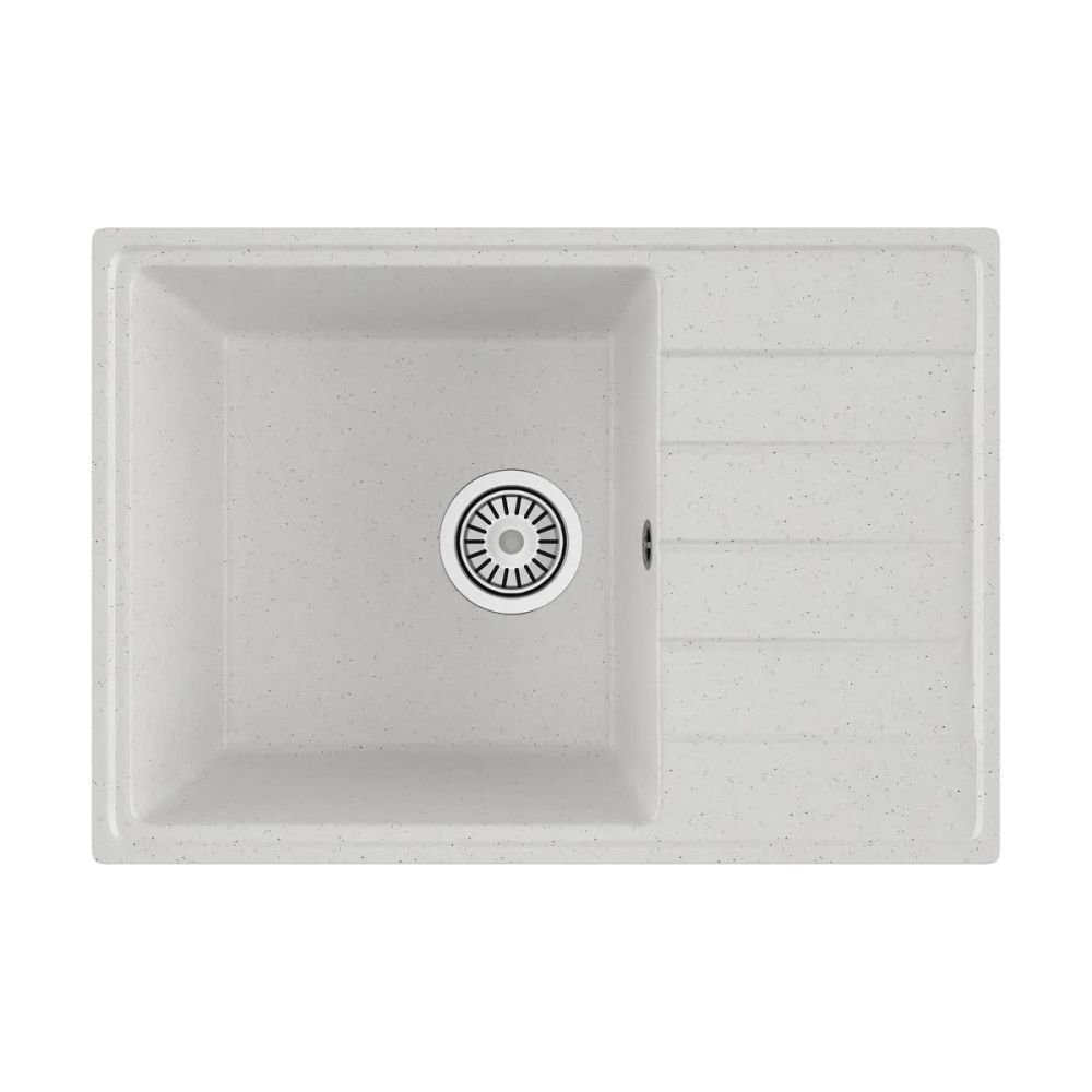 Мойка изготовлена из искусственного камня, который представляет собой композит натурального мрамора и связующих смол. Благодаря этому материалу, шум от падающей воды становится значительно тише.