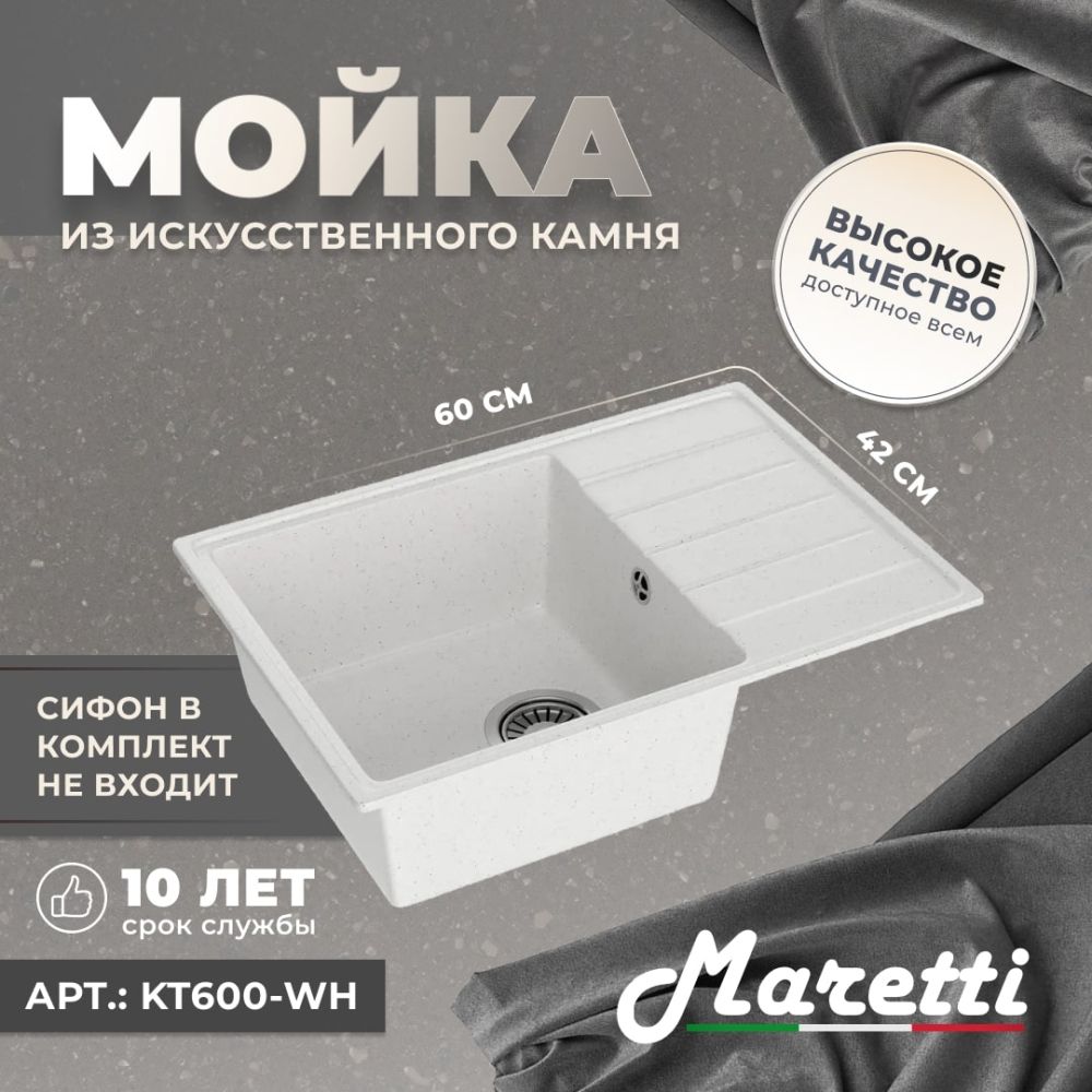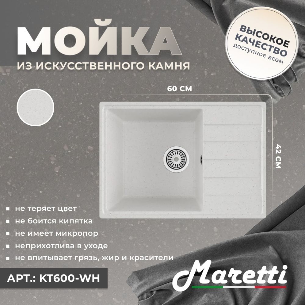 Односекционная реверсивная мойка Maretti Kitchen 600 с плоским крылом идеально подойдёт для небольшой кухни. Крыло можно расположить как справа, так и слева. Мойка не имеет готовых отверстий под смеситель.
