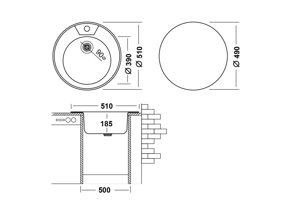 Модель врезного способа монтажа имеет размеры 510 мм в диаметре и предназначена для установки в тумбу от 45 см.