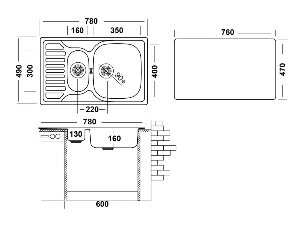 Модель врезного способа монтажа, имеет размеры 780х490 мм и предназначена для установки в тумбу от 60 см.
