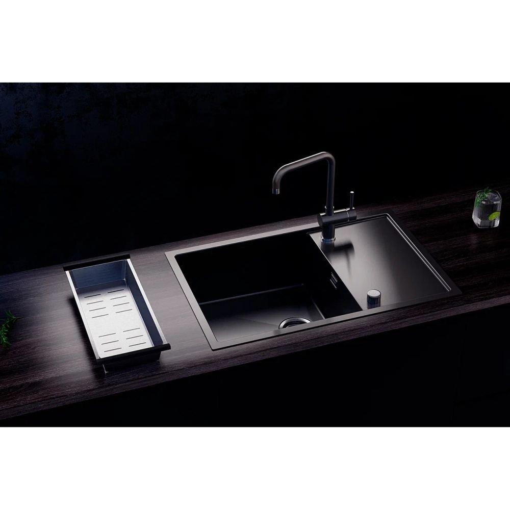 Реверсивная односекционная мойка с крылом ULGRAN STEEL 780 Х 500, цвет «черная брашированная сталь» с брендированным плоским переливом изготовлена из высококачественной хирургической стали марки AISI 304 и абсолютно безопасна для здоровья человека. Изделие имеет два готовых отверстия диаметром по 35 мм под смеситель и под круглую ручку управления клапан-полуавтоматом. Мойка является оборачиваемой - крыло можно расположить как справа, так и слева, по желанию потребителя.
