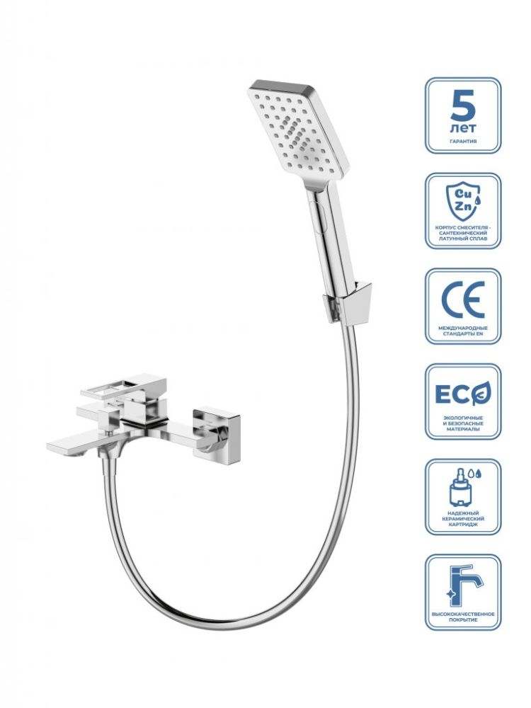 Оснащение: эксцентрики, аэратор, девиатор, 3-х режимная душевая лейка из ABS, душевой шланг 150 см PVC, держатель душевой лейки из ABS