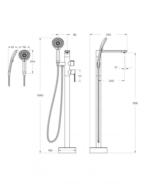 Оснащение: душевой шланг ПВХ длиной 150 см, ручной душ 3-х режимный, аэратор, держатель для душевой лейки, дивертор