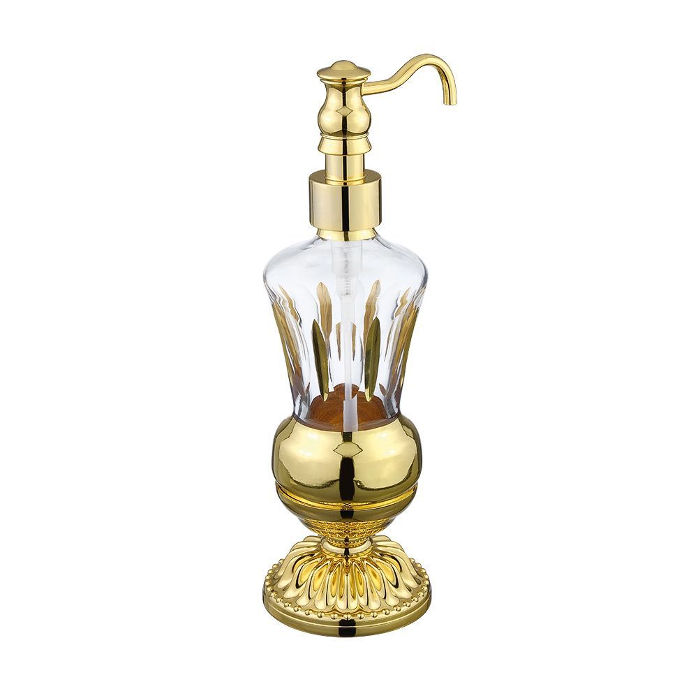 Настольный дозатор жидкого мыла коллекции LUXOR бренда MIGLIORE выполнен из латуни и высококачественного хрусталя, декорированного золотом 24 кт. При необходимости хрустальный дозатор можно вынуть из посадочного места, чтобы помыть. Изделие выполнено из высококачественной латуни и имеет гальваническое покрытие золотом 24 карата. Внимание: золотое покрытие очень деликатное и для ухода рекомендуется использовать чистящее средство бренда MIGLIORE для смесителей и аксессуаров с деликатными покрытиями бронза, золото, медь и протирать мягкой ветошью.