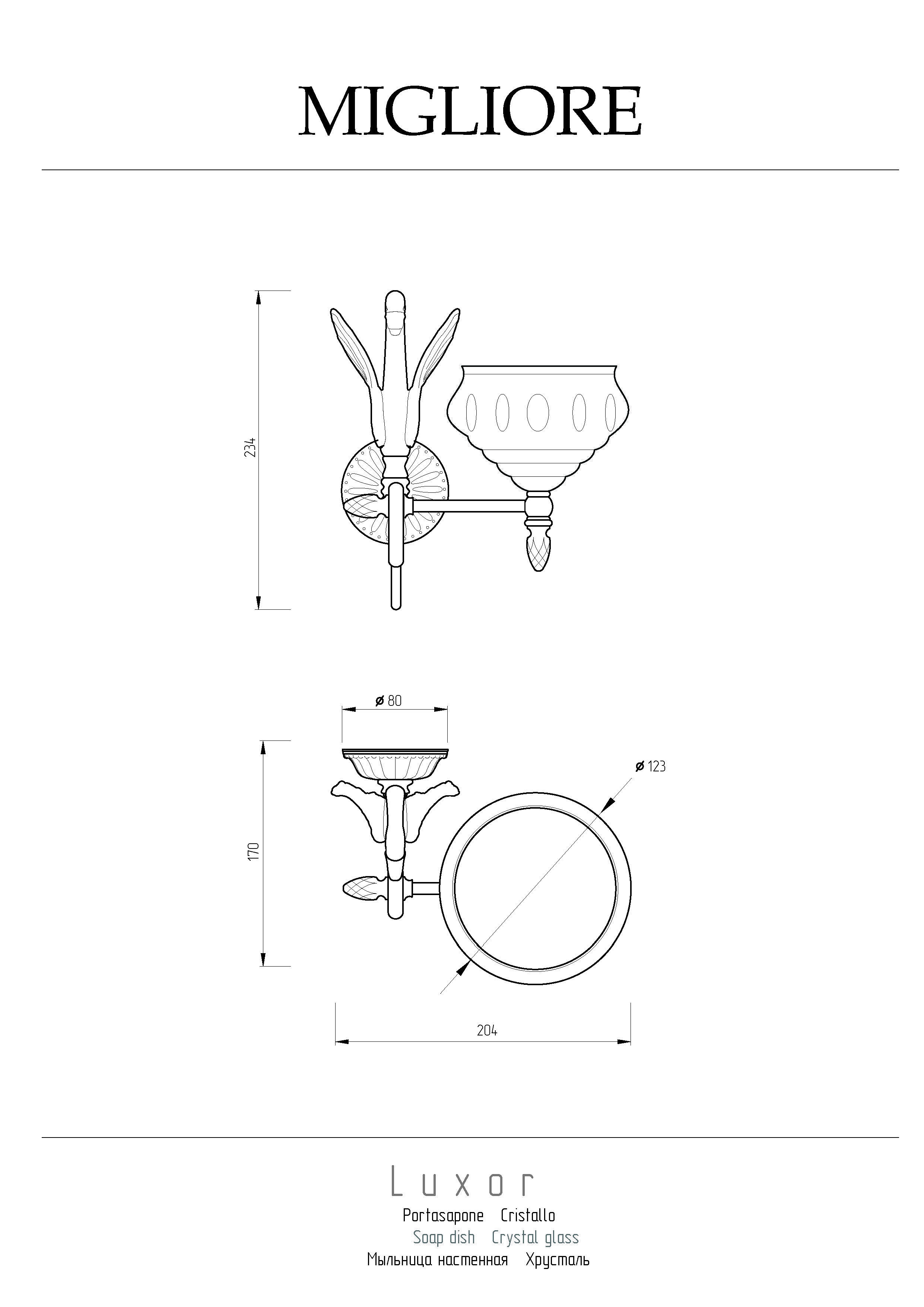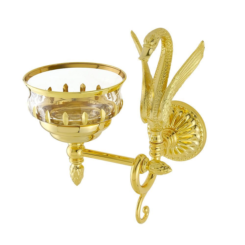 Мыльница настенная коллекции LUXOR бренда MIGLIORE — это незаменимый аксессуар для создания роскошного интерьера ванной комнаты. Мыльница выполнена из высококачественного хрусталя и декорирована золотом 24 кт. При необходимости хрустальную мыльницу можно вынуть из посадочного места, чтобы помыть. Изделие выполнено из высококачественной латуни и имеет гальваническое покрытие золотом 24 карата. Внимание: золотое покрытие очень деликатное и для ухода рекомендуется использовать чистящее средство бренда MIGLIORE для смесителей и аксессуаров с деликатными покрытиями бронза, золото, медь и протирать мягкой ветошью.