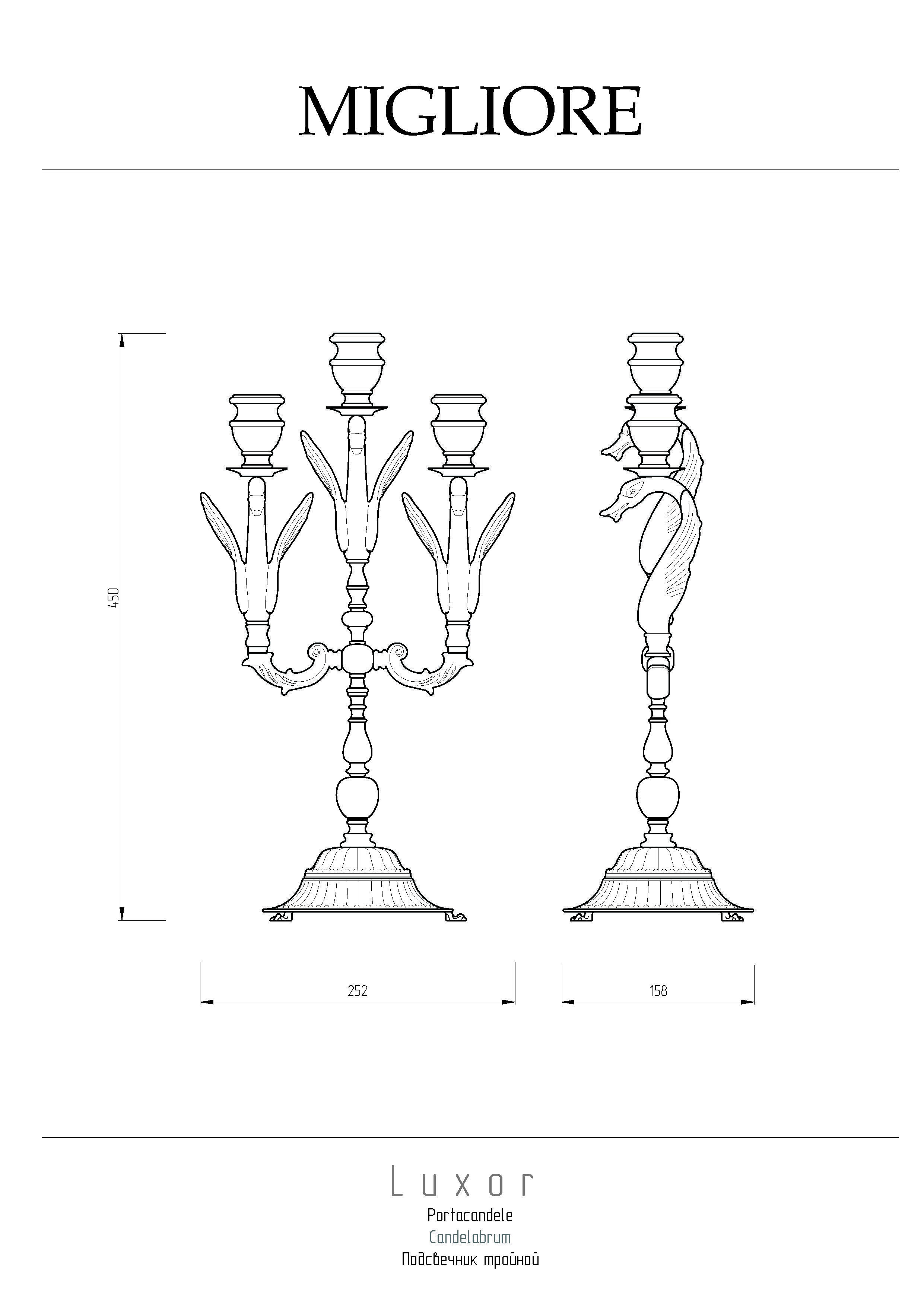 Подсвечник тройной коллекции LUXOR бренда MIGLIORE имеет высоту 49 см и будет достойным украшением на столешнице в ванной комнате, на каминной полке или на столике. Данный подсвечник также будет прекрасным подарком для всех, кто ценит красоту и качество. Изделие выполнено из высококачественной латуни и имеет гальваническое покрытие золотом 24 карата. Внимание: золотое покрытие очень деликатное и для ухода рекомендуется использовать чистящее средство бренда MIGLIORE для смесителей и аксессуаров с деликатными покрытиями бронза, золото, медь и протирать мягкой ветошью.