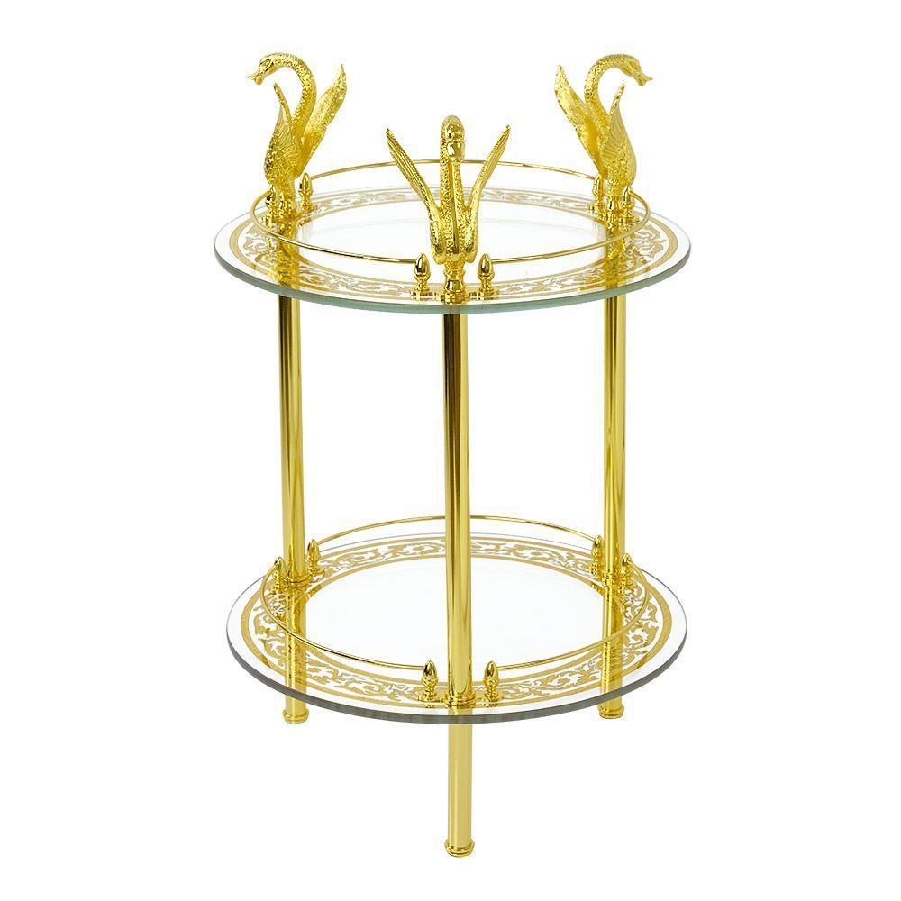 Столик коллекции LUXOR бренда MIGLIORE - это красивый и многофункциональный аксессуар, который станет достойным украшением вашего интерьера. Столик на колесах, две круглые полочки выполнены из высококачественного декорированного стекла с изящным латунным обрамлением по периметру. Изделие выполнено из высококачественной латуни и имеет гальваническое покрытие золотом 24 карата. Внимание: золотое покрытие очень деликатное и для ухода рекомендуется использовать чистящее средство бренда MIGLIORE для смесителей и аксессуаров с деликатными покрытиями бронза, золото, медь и протирать мягкой ветошью.