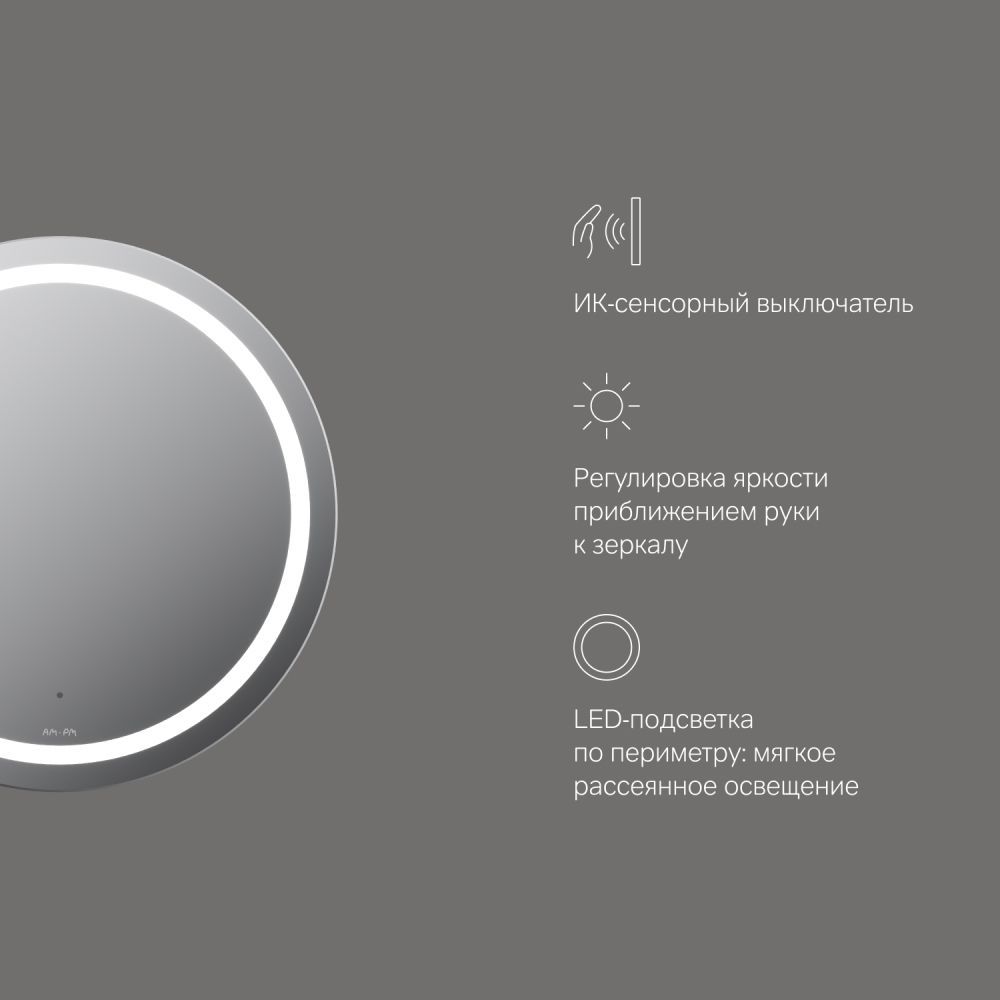 Яркая контурная LED-подсветка обеспечивает отличное рассеянное освещение и отсутствие теней. Срок службы светодиодов составляет более 30 000 часов. Бесконтактный сенсорный выключатель Touchless – никаких отпечатков на зеркальном полотне! Свет включается легким взмахом руки. Функция диммирования позволяет регулировать яркость жестом. Гарантия 3 года